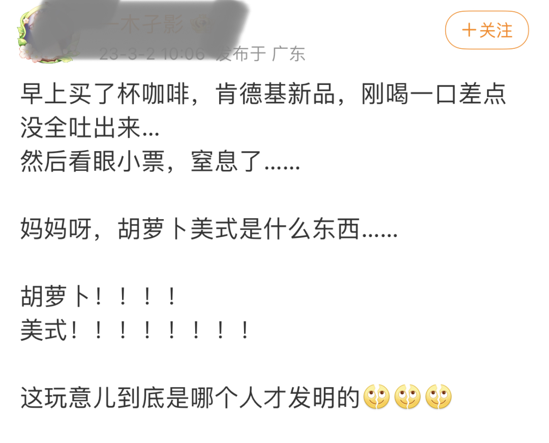 为了制造饥饿感,这款胡萝卜美式“限时”又“限量。据肯德基官方,2月底会在北上广深限时登场。大概是因为话题效应不错,随后又宣布在3月13日(仅1天)福州、厦门、长沙限量上市。