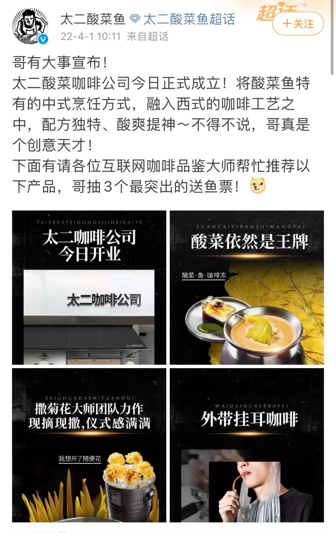 虽然许多品牌都开始做咖啡,但太二在愚人节宣布这件“大事”,就应该也是假新闻吧?