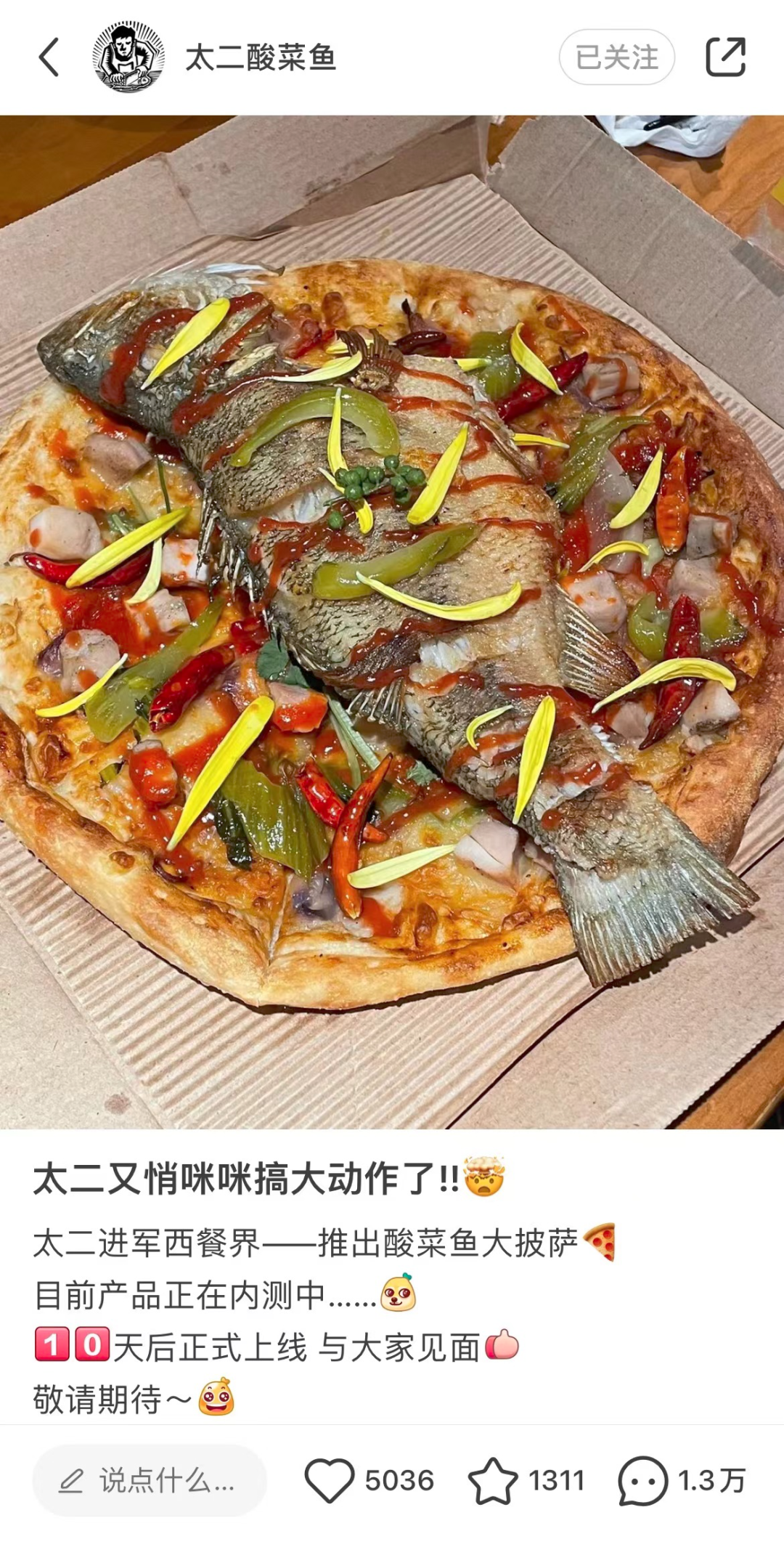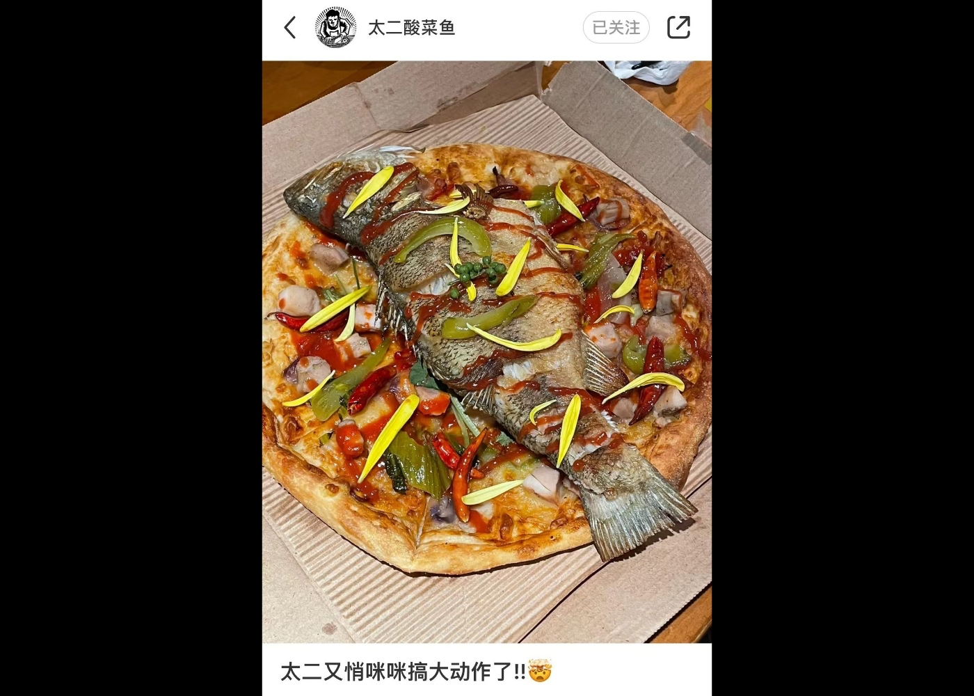 太二新品酸菜鱼披萨,但是一整条?