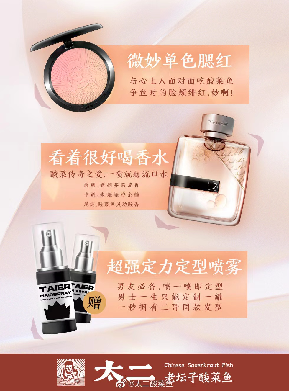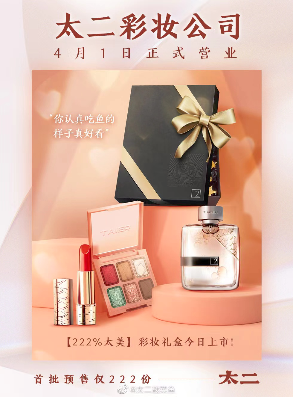 最近几年的愚人节,太二总是会做一些让人想不到的事情,比如2021年,太二说自己要开彩妆公司,用口红、眼影、腮红等单品,为大家打造一款“酸菜鱼妆”。首批美妆套盒预售仅222份。