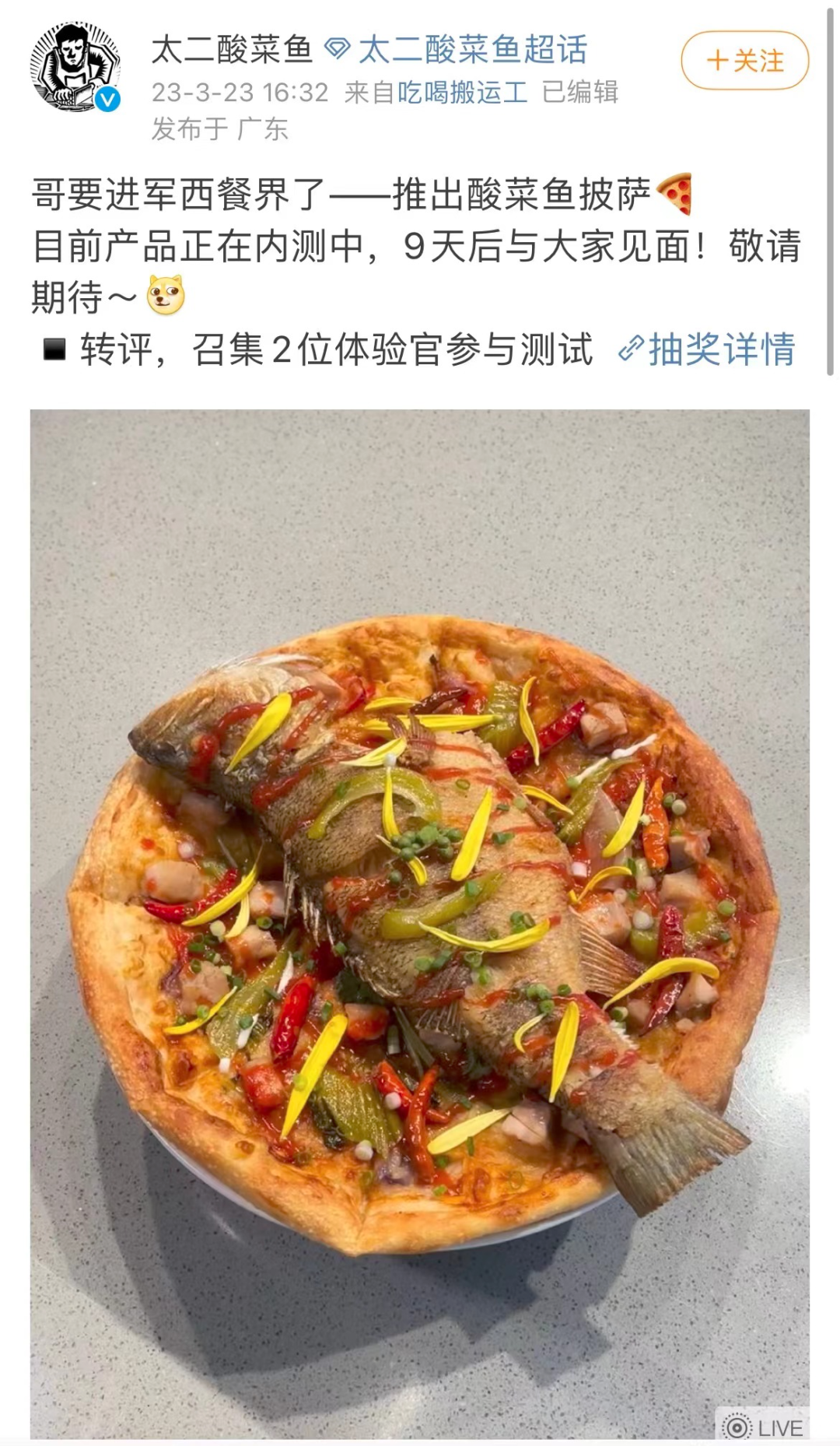 不管最后能不能让消费者吃到,对太二来说,酸菜鱼大披萨的作用都差不多达到了。