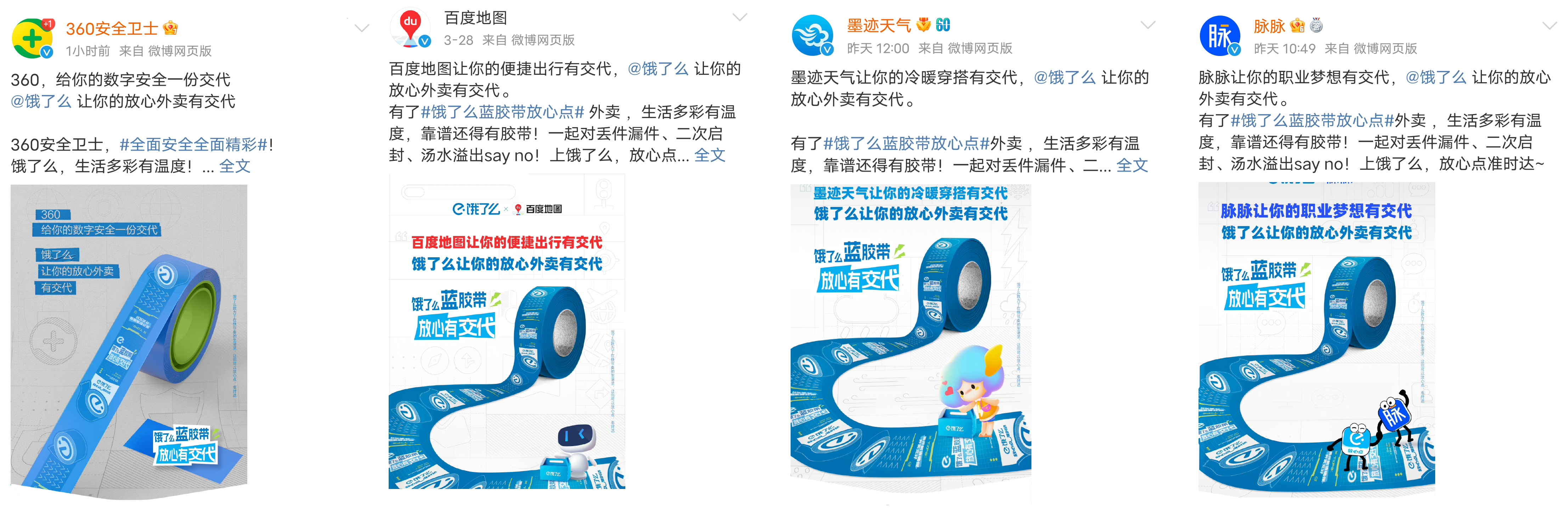 配合“蓝胶带”在网上的亮相,饿了么联动了多个同样有安心安全感心智的异业品牌玩梗互动,和饿了么联盟官宣为饿了么蓝胶带打call:饿了么让用户放心点外卖有交代,360安全卫士让用户的网络安全有交代;百度地图让用户的便捷出行有交代……“交代”的趣味破圈由此产生了指数级扩散与传播。