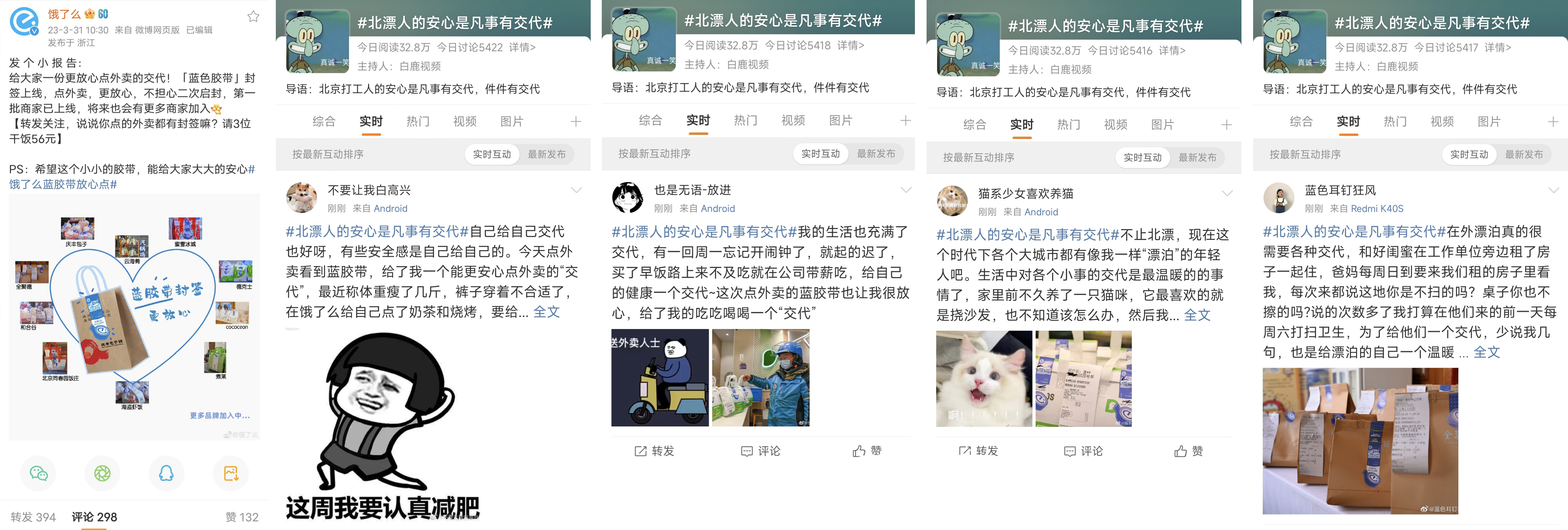 由此,饿了么下场官宣的#饿了么蓝胶带放心点#话题,吸引了平台商户、异业品牌、微博KOL互动的同时,也引发了大量UGC的自发讨论,并发酵出外围话题#北漂人的安心是凡事有交代#,活动总曝光达1.25亿。