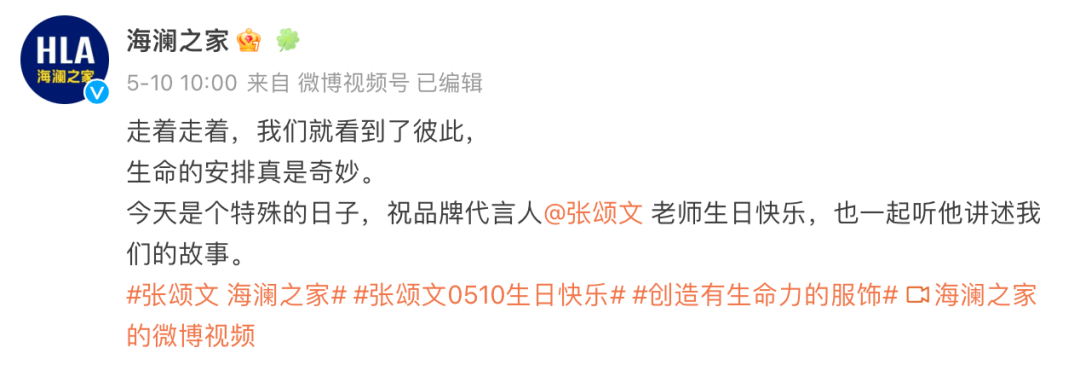 5月10日是中国品牌日,也是张颂文的生日。海澜之家在这一天官宣他为品牌代言人,并祝福生日快乐。