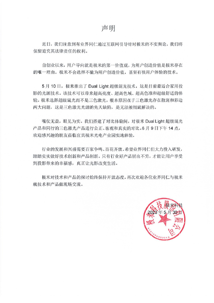 5 月 30 日23时31分,极米官方发布声明表示嘴仗无益,眼见为实,并搭建了对比体验间对极米 Dual Light 超级混光产品和同行的三色激光产品进行公正、客观和真实的对比。