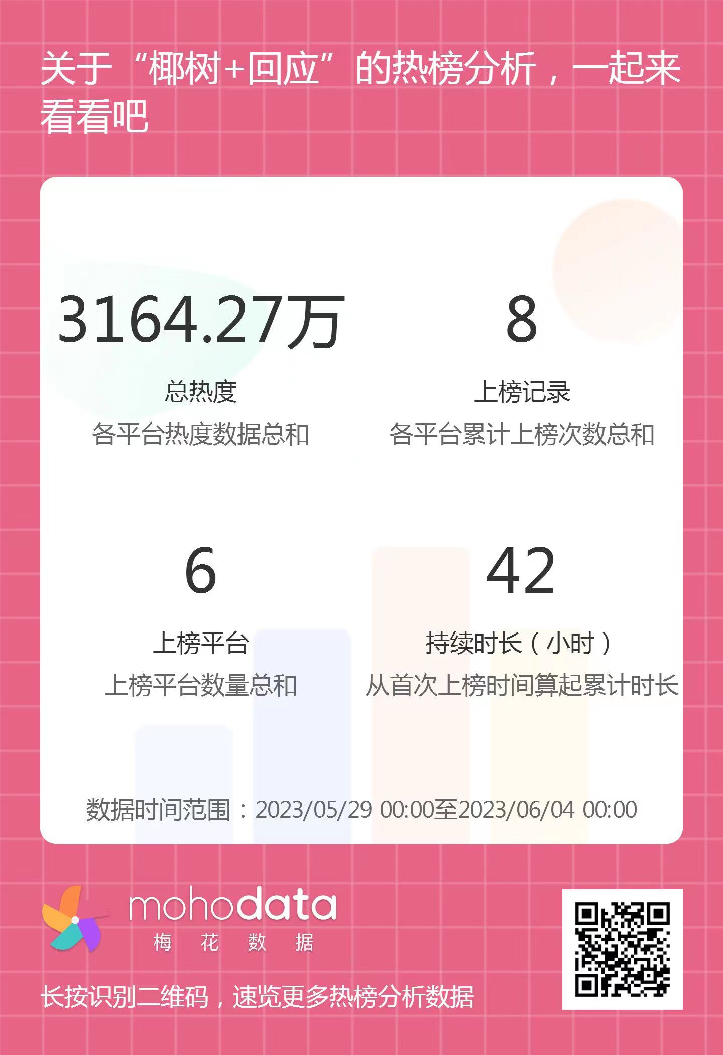 热搜方面,椰树事件相关热搜热度总计3164.27万,上榜记录8次,上榜平台6家,持续时长42小时。详情可扫描以下二维码查看。