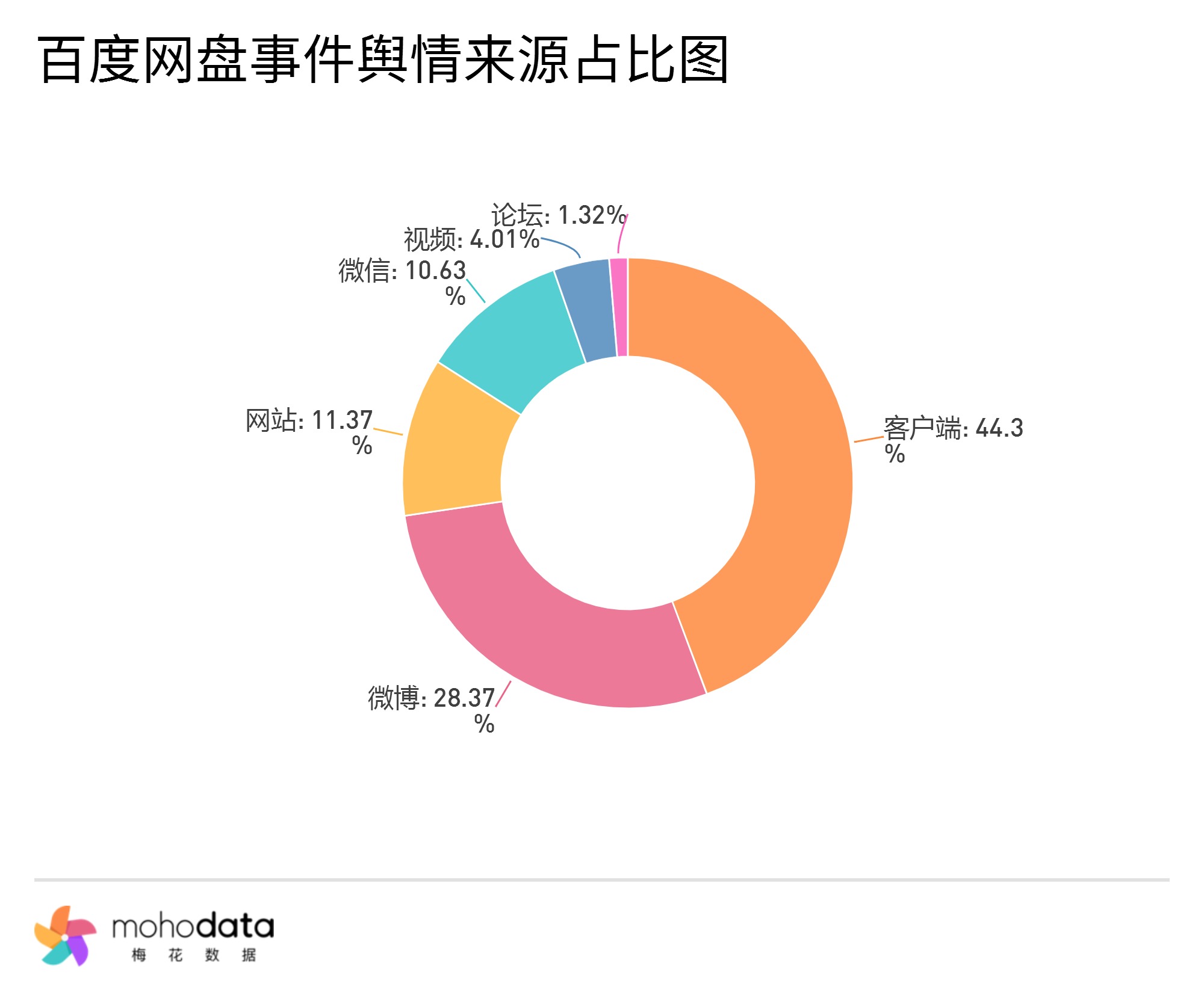 其中信息来源分布图如下图所示,声量主要集中在客户端,客户端占比44.30%,微博占比28.37%,网站占比11.37%,微信占比10.63%,其他信息来源占比不超过10%。