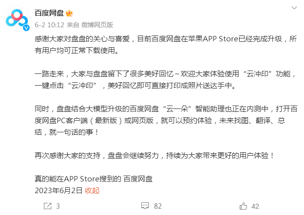6月2日上午,百度网盘在官方微博发布消息称,目前百度网盘在苹果APP Store已经完成升级,所有用户均可正常下载使用。