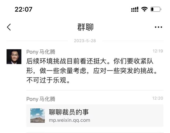 6月2日,腾讯董事会主席兼CEO马化腾微信聊天记录截图刷屏,马化腾转发了一篇《聊聊裁员的事》,并表示“后续环境挑战目前看还挺大。你们要收紧队形,做一些余量考虑,应对一些突发的挑战。不可过于乐观。”