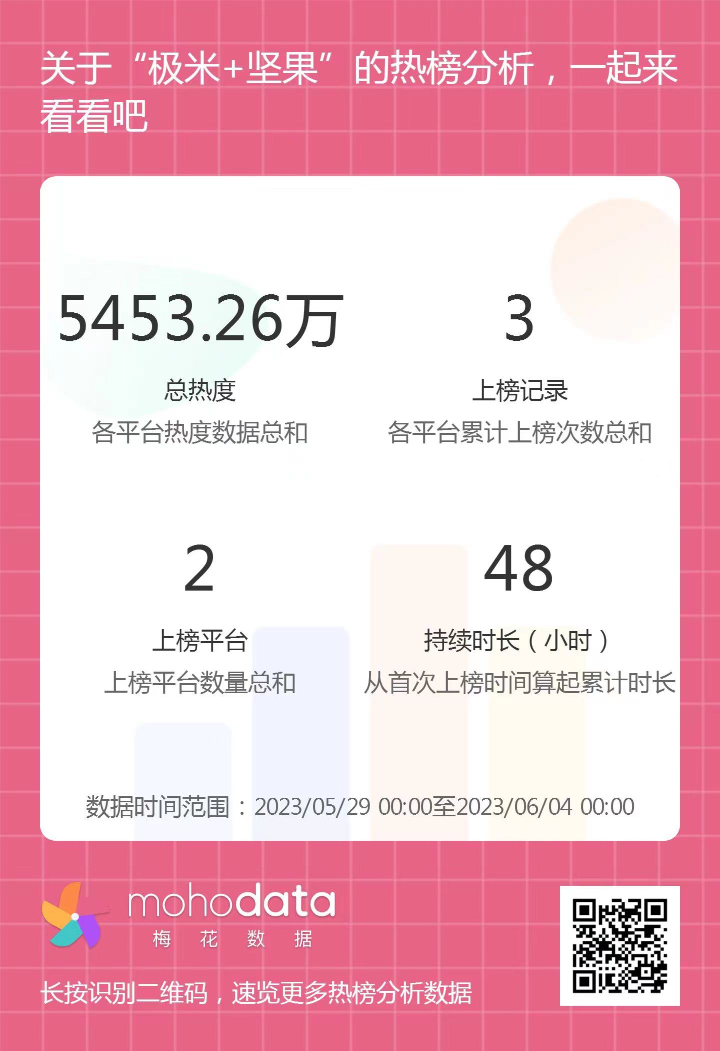 热搜方面,梅花数据统计此次极米坚果事件的相关热搜,其中热搜热度总计5453.26万,上榜记录3次,上榜平台2家,持续时长48小时。详情可扫描以下二维码查看。