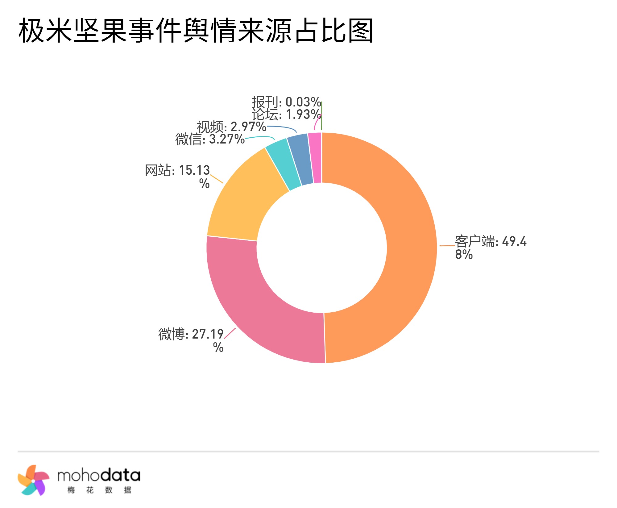 其中信息来源分布图如下图所示,声量主要集中在客户端,客户端占比49.48%,微博占比27.19%,网站占比15.13%,其他信息来源占比不超过10%。