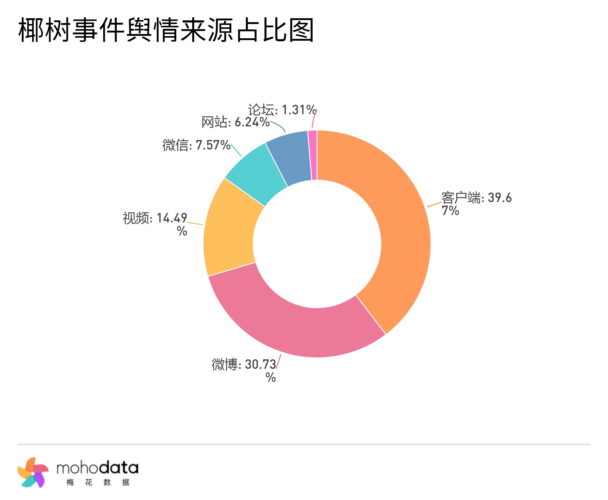 其中信息来源分布图如下图所示,声量主要集中在客户端,客户端占比39.67%,微博占比30.73%,视频占比14.49%,其他信息来源占比不超过10%。