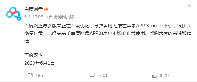 6月1日下午,百度网盘在官方微博发布消息称,百度网盘最新版本正在升级优化,导致暂时无法在苹果APP Store中下载,很快会恢复正常,已经安装了百度网盘APP的用户不影响正常使用。