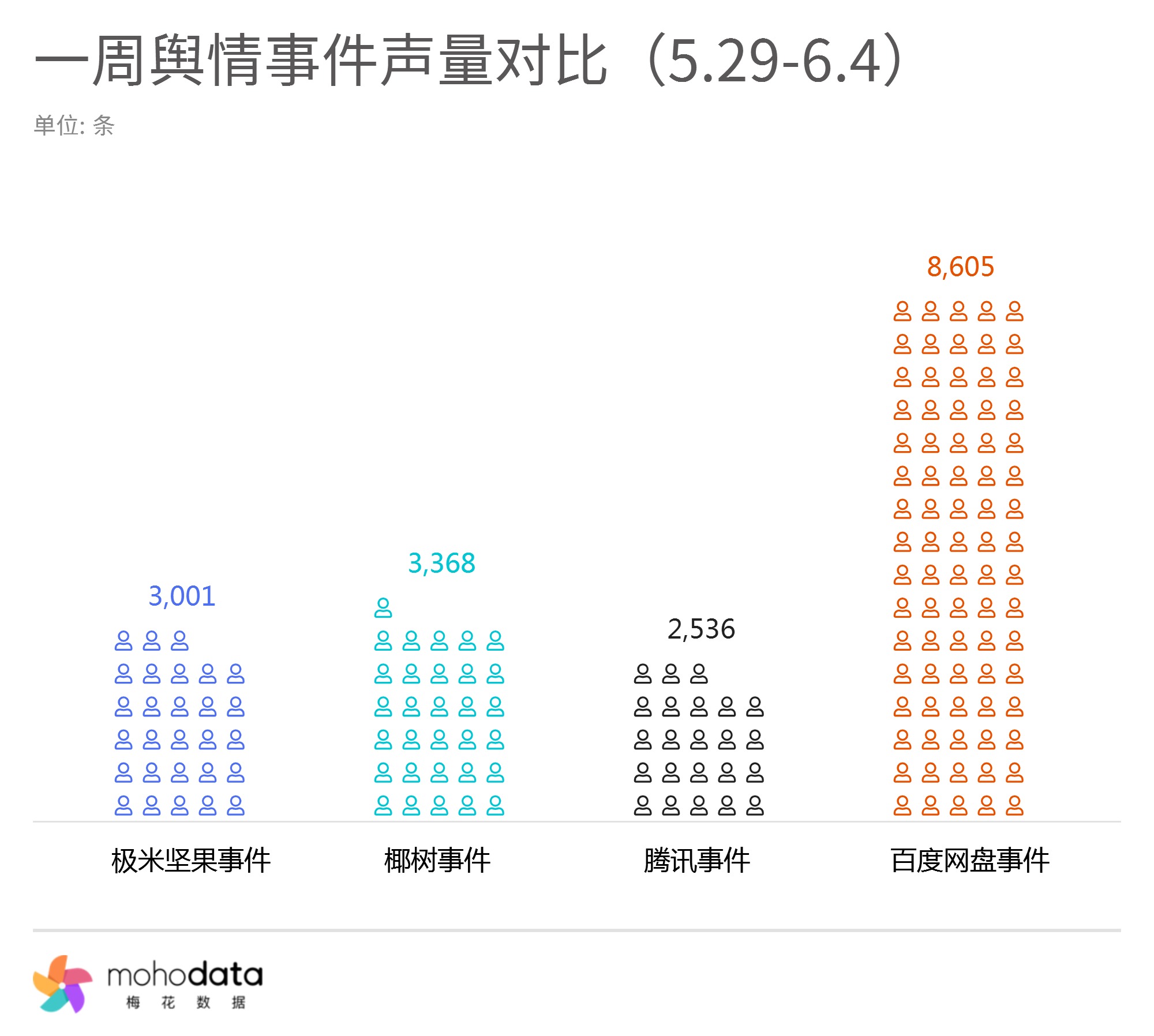 舆情声量方面,上周的主要负面舆情当中,“百度网盘事件”声量最高,监测期间共监测到舆情声量8605条,其次 “椰树事件”舆情声量为3368条,“极米事件”舆情声量为3001条,“腾讯事件”舆情声量为2536条。