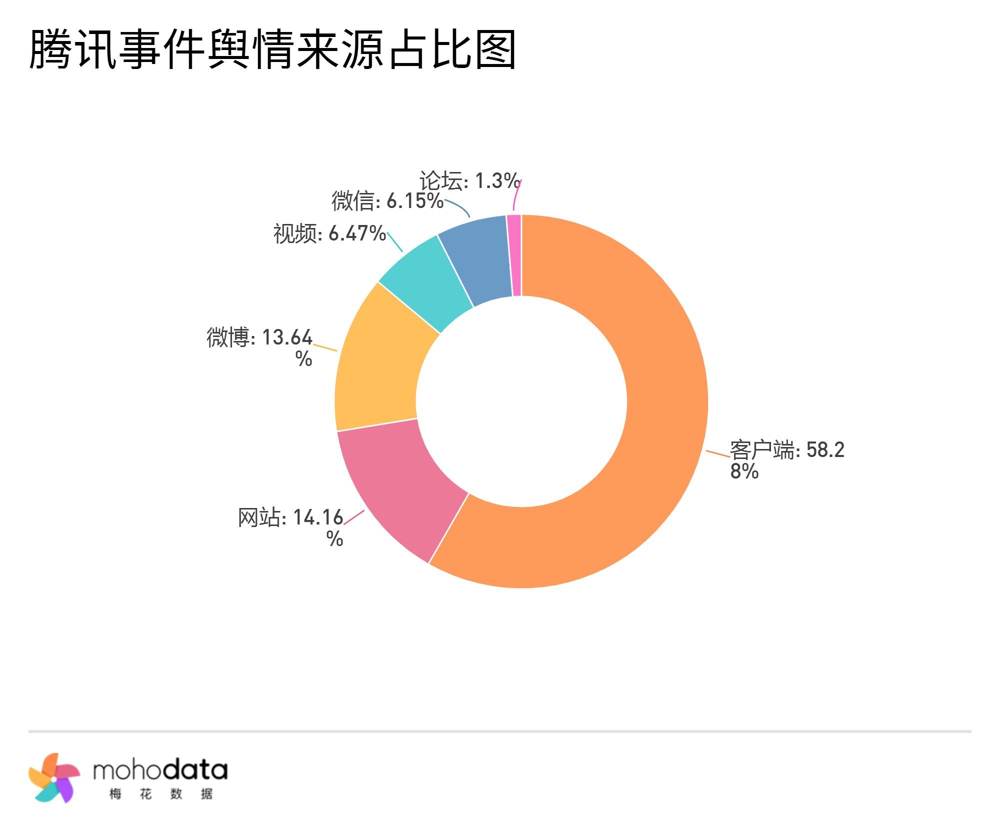 其中信息来源分布图如下图所示,声量主要集中在客户端,客户端占比58.28%,网站占比14.16%,微博占比13.64%,其他信息来源占比不超过10%。