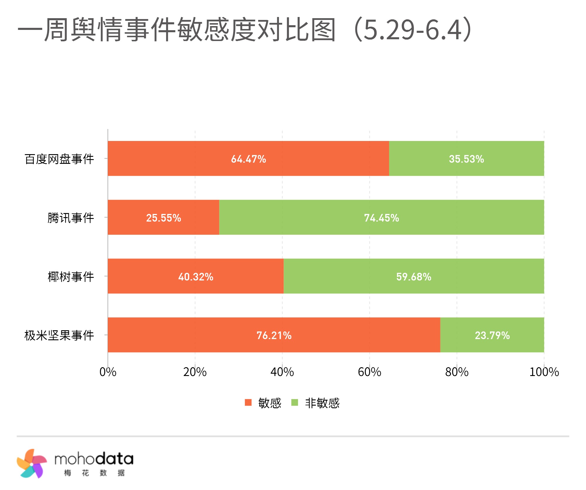 敏感度方面,“极米坚果事件”相关的敏感度最高,占比达76.21%。“百度网盘事件”占比达64.47%, “椰树事件”占比达40.32%, “腾讯事件”占比达25.55%。