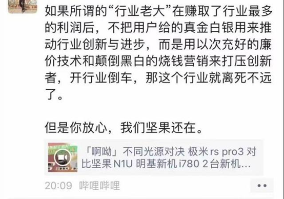 5 月 29 日,一张坚果投影首席产品官王骁逸的朋友圈截图流传开来,王骁逸在朋友圈表示," 如果所谓的‘行业老大’在赚取了行业最多的利润后,不把用户给的真金白银用来推动行业创新与进步,而是用以次充好的廉价技术和颠倒黑白的烧钱营销来打压创新者,开行业倒车,那这个行业就离死不远了。"