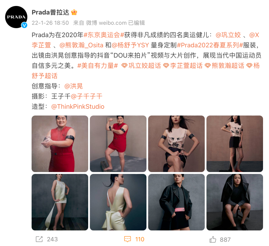 其实,这并不是Prada第一次合作我国的女运动员。2022年初,Prada即为四位在赛事中取得骄人成绩的“她们”定制2022春夏系列服装。