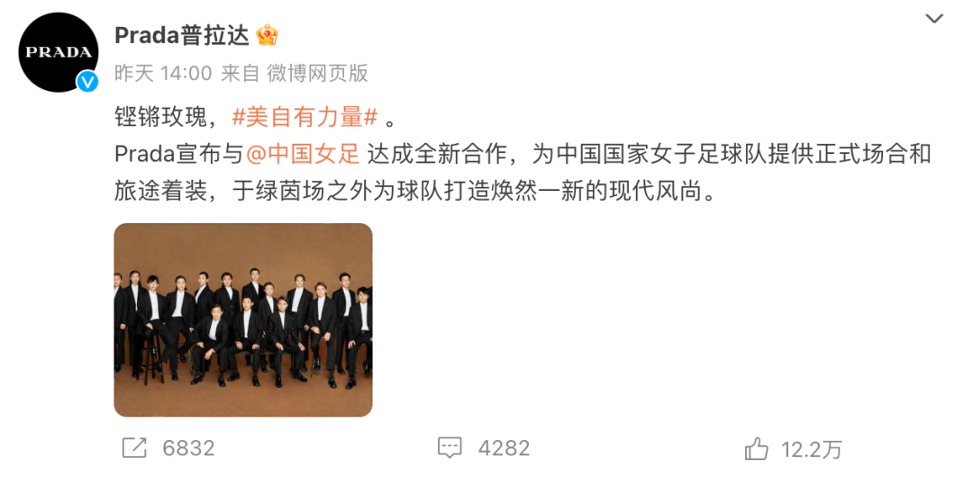 昨天下午2点,Prada微博官宣与中国女足达成合作,为其提供正式场合和旅途着装。话题#Prada这次找对人了#迅速登上热搜榜。许多网友们毫不吝啬地给出正面评价:选得好,有眼光。