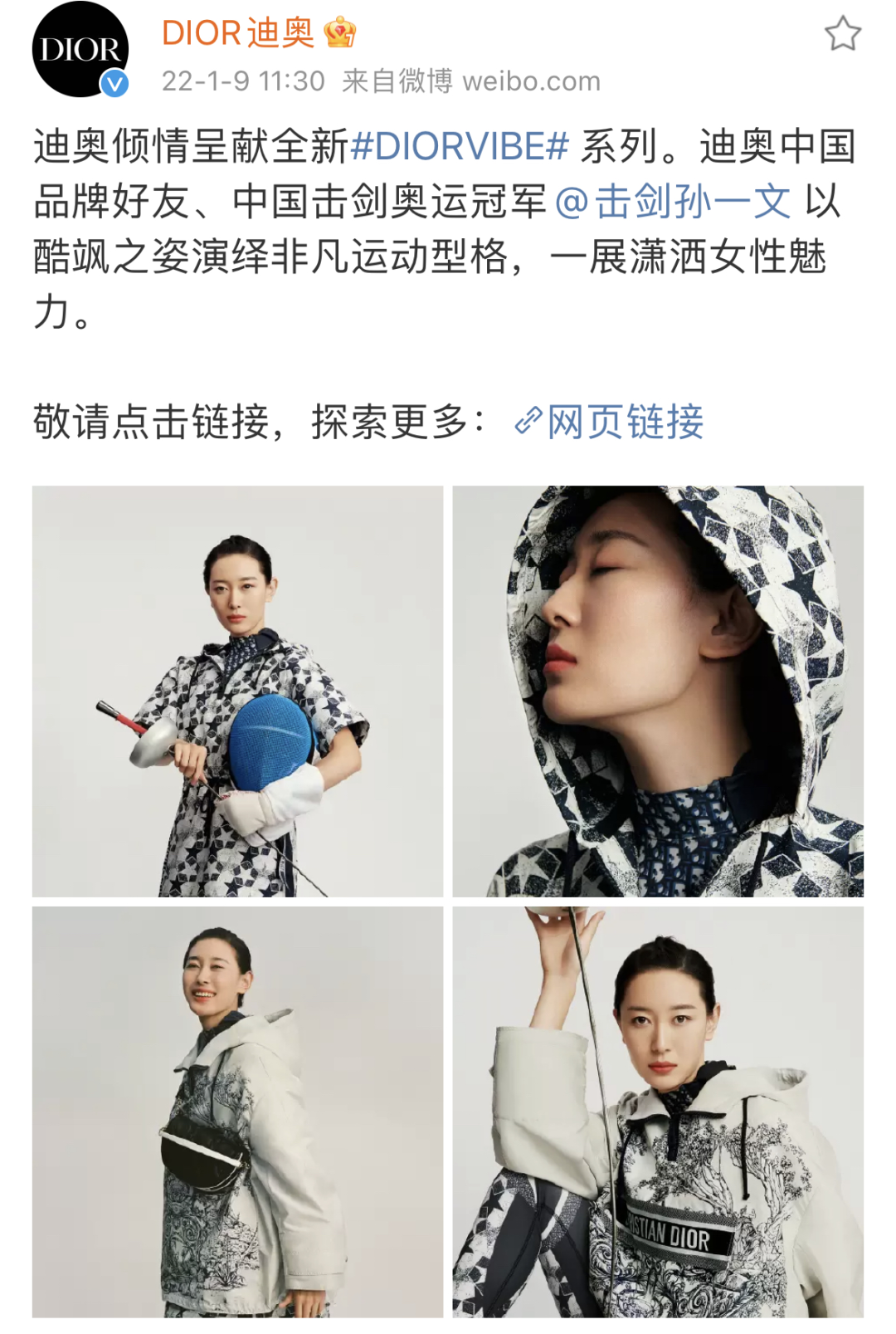 而如今情况则大有不同,女性运动们正走近“时尚奢品圈”。22年1月份,中国击剑选手孙一文成为迪奥品牌好友。在为迪奥拍摄的广告视频里,孙一文身穿迪奥Vibe早春系列印花运动套装,用自身经历讲述着“女子力量”。