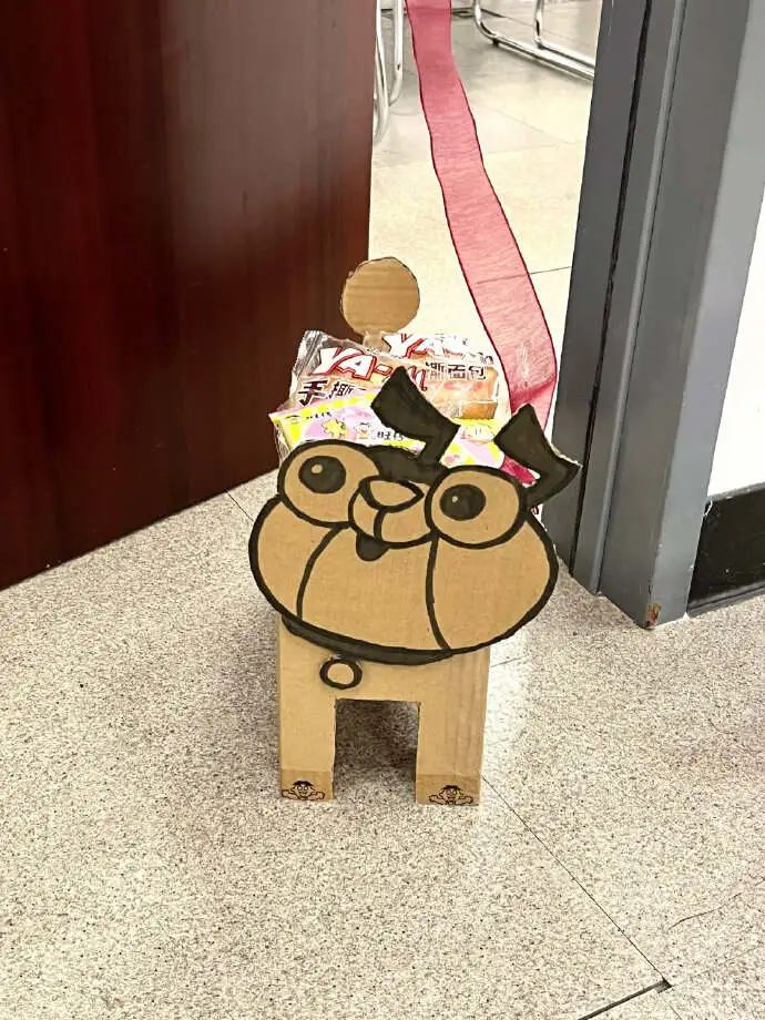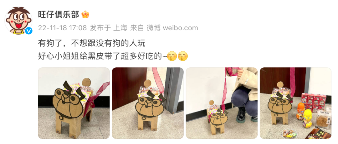 去年有一段时间,大学生集体“发疯”,在宿舍养(纸板)狗,旺旺也蹭热度做了一只狗。狗狗的形象是品牌IP之一的“黑皮”。