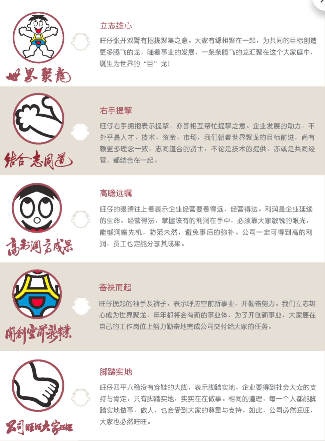 小编翻了下官网,合着是高瞻远瞩的意思。旺仔的眼睛向上看表示“企业经营要看得远,经营得法”。