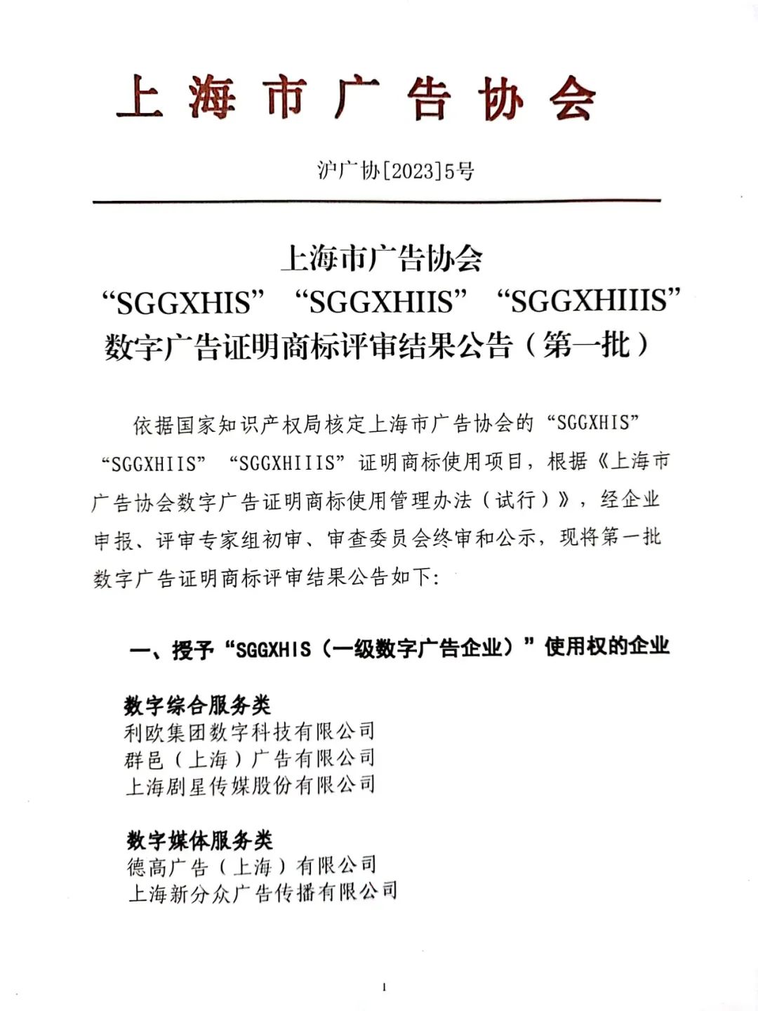 上海市广告协会 数字广告证明商标评审结果公告(第一批) 2023-08-10 快速评论依据国家知识产权局核定上海市广告协会的“SGGXHIS”“SGGXHIIS”“SGGXHIIIS”证明商标使用项目,现将第一批数字广告证明商标评审结果公告 具体公告如下: 200