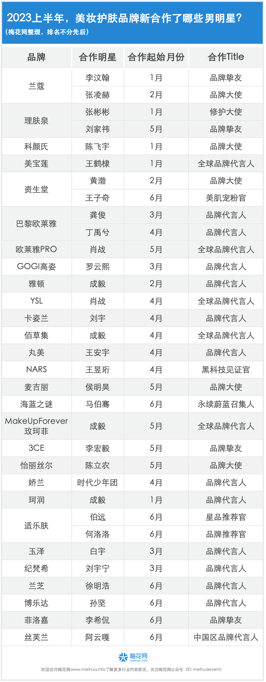 据梅花网不完全统计,仅今年上半年,就有28 家美妆护肤类品牌发布男明星担任代言的消息。不难看出,男明星蚕食美妆类代言市场情况仍在继续。