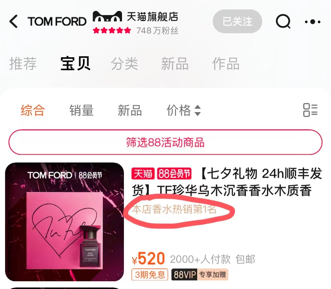 与此同时,日上免税APP中也在销售同款香水。产品非礼盒包装,价格大约是旗舰店铺同款的三分之二。然而目前,该香水已成为TOM FORD天猫官方店铺香水热销第1名。