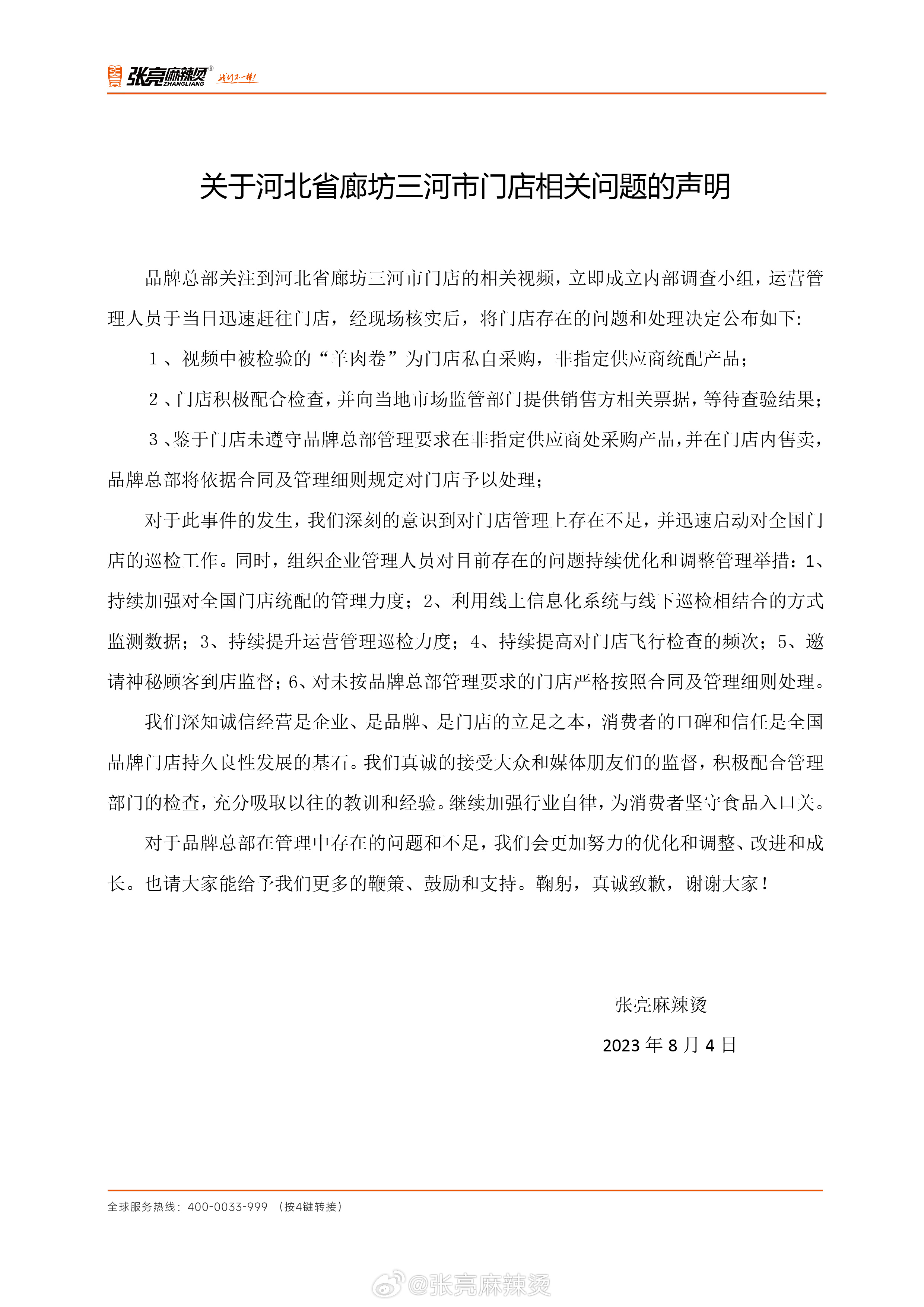 对此,8月4日张亮麻辣烫在其官微发布关于河北省廊坊三河市门店相关问题的声明称,该网友视频中被检验的“羊肉卷”为门店私自采购,非指定供应商统配产品,鉴于门店未遵守品牌总部管理要求在非指定供应商处采购产品,将对其进行处理。