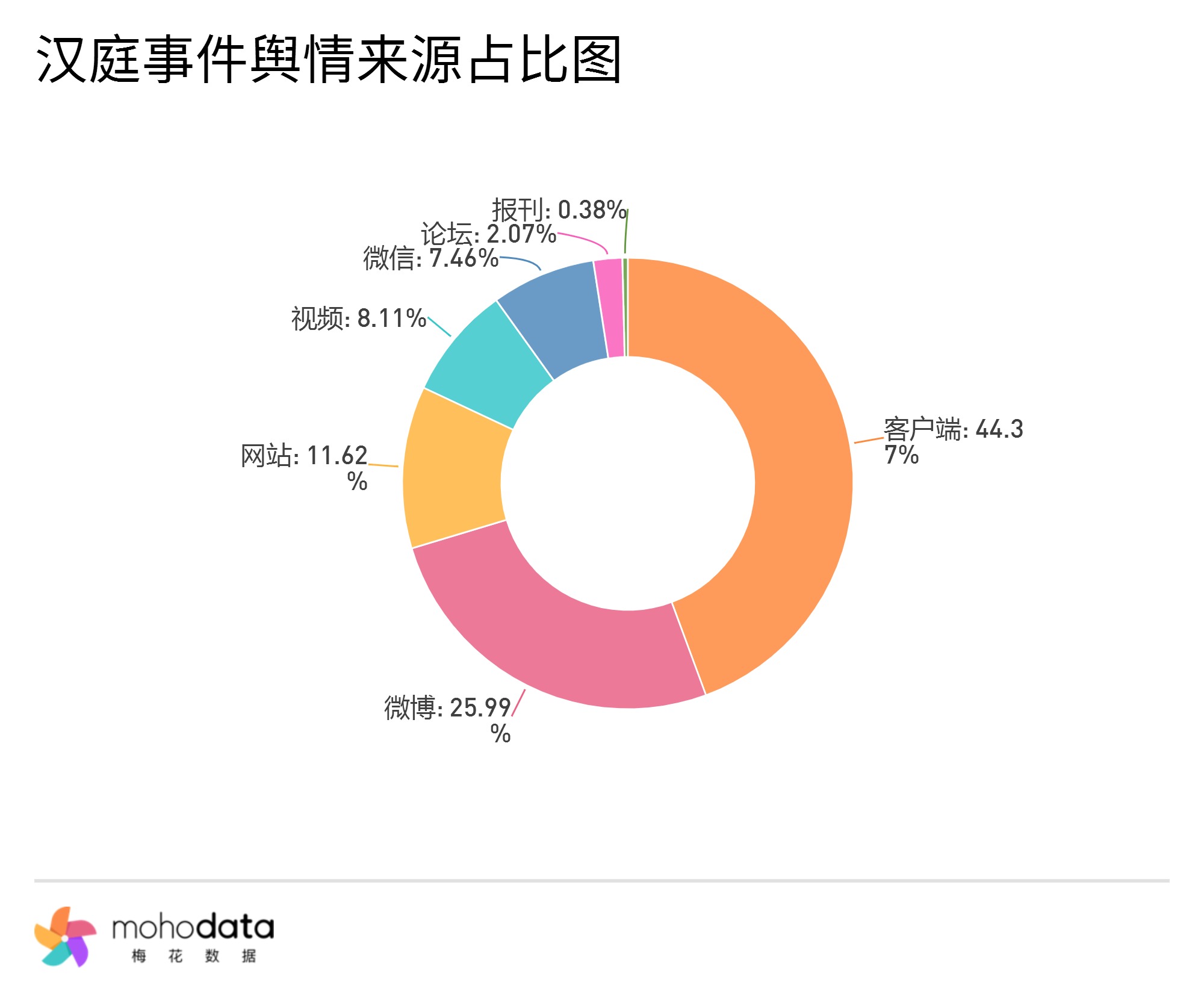 其中信息来源分布图如下图所示,声量主要集中在客户端,客户端占比44.37%,微博占比25.99%,网站占比11.62%,其他信息来源占比不超过10%。