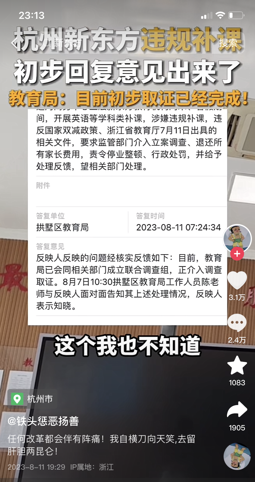 8月4日至7日,他接连发布四段视频,曝光杭州新东方违规补课情况,并称已提交相关材料向教育局、市监局等部门举报。视频中,他称自己的诉求是让涉事企业退还家长全部的违规补课费用、立即停止并取缔违规补课的行为,并让企业得到行政处罚。视频显示,他8月7日在杭州市拱墅区教育局递交了涉事教培机构的相关资料。