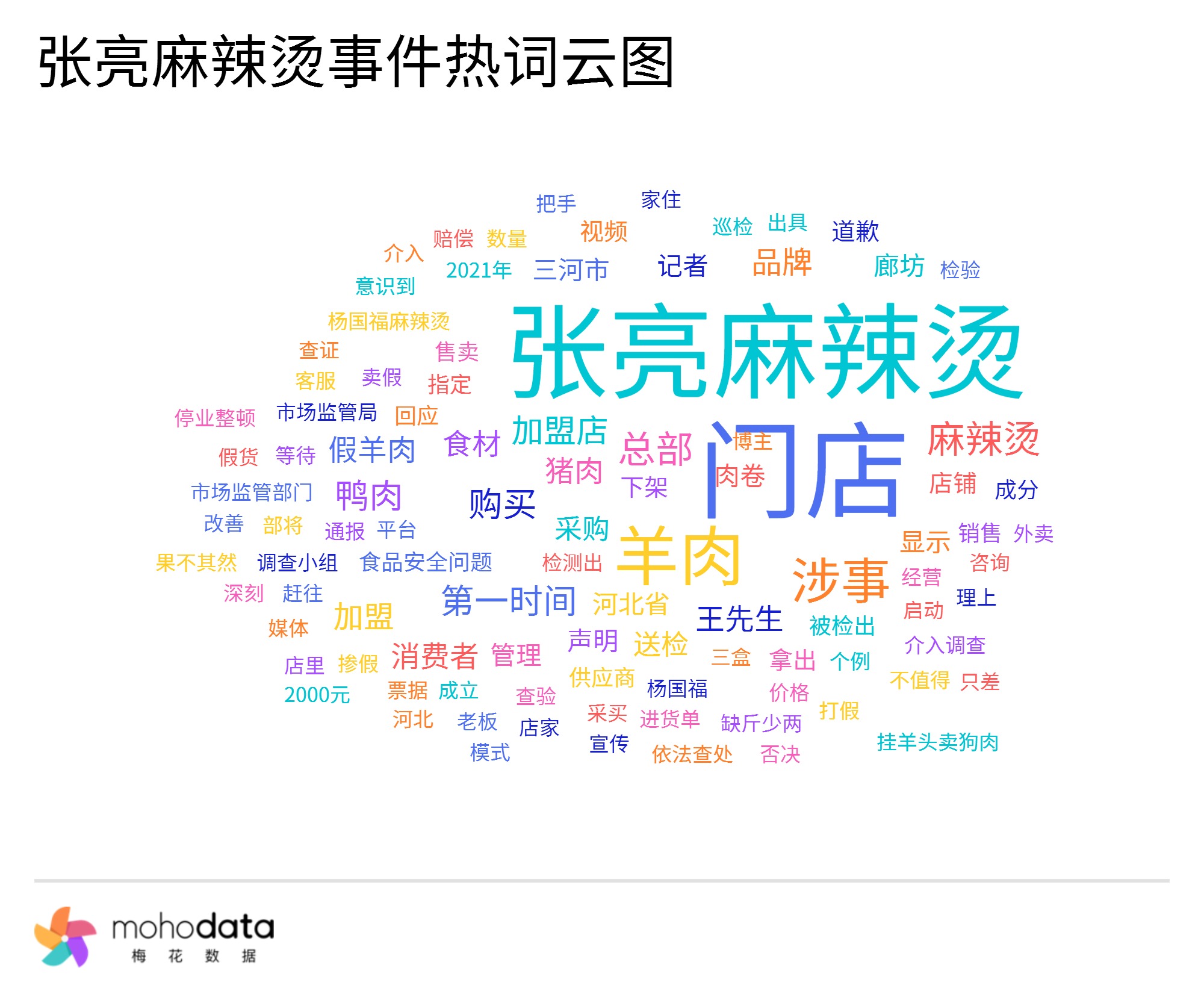 声量热词方面,热词云图如下所示,其中“加盟店”“管理”“道歉”“食品安全问题”“卖假”“掺假”“缺斤少两”“打假”“质疑”“监管不严”等词汇排名较前。