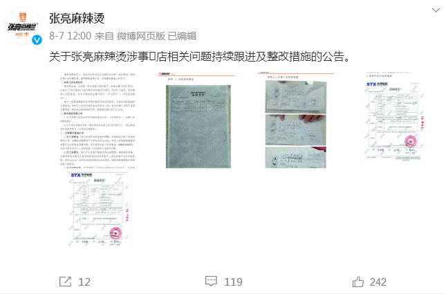 今年3月,张亮麻辣烫有门店因缺斤短两登上热搜。随后张亮麻辣烫发布声明称,涉事门店为上海新南街加盟店、江川北路加盟店,主要由于工作人员操作不规范造成秤重误差。对上述两门店做出勒令立即整改,人员重新培训的处理。