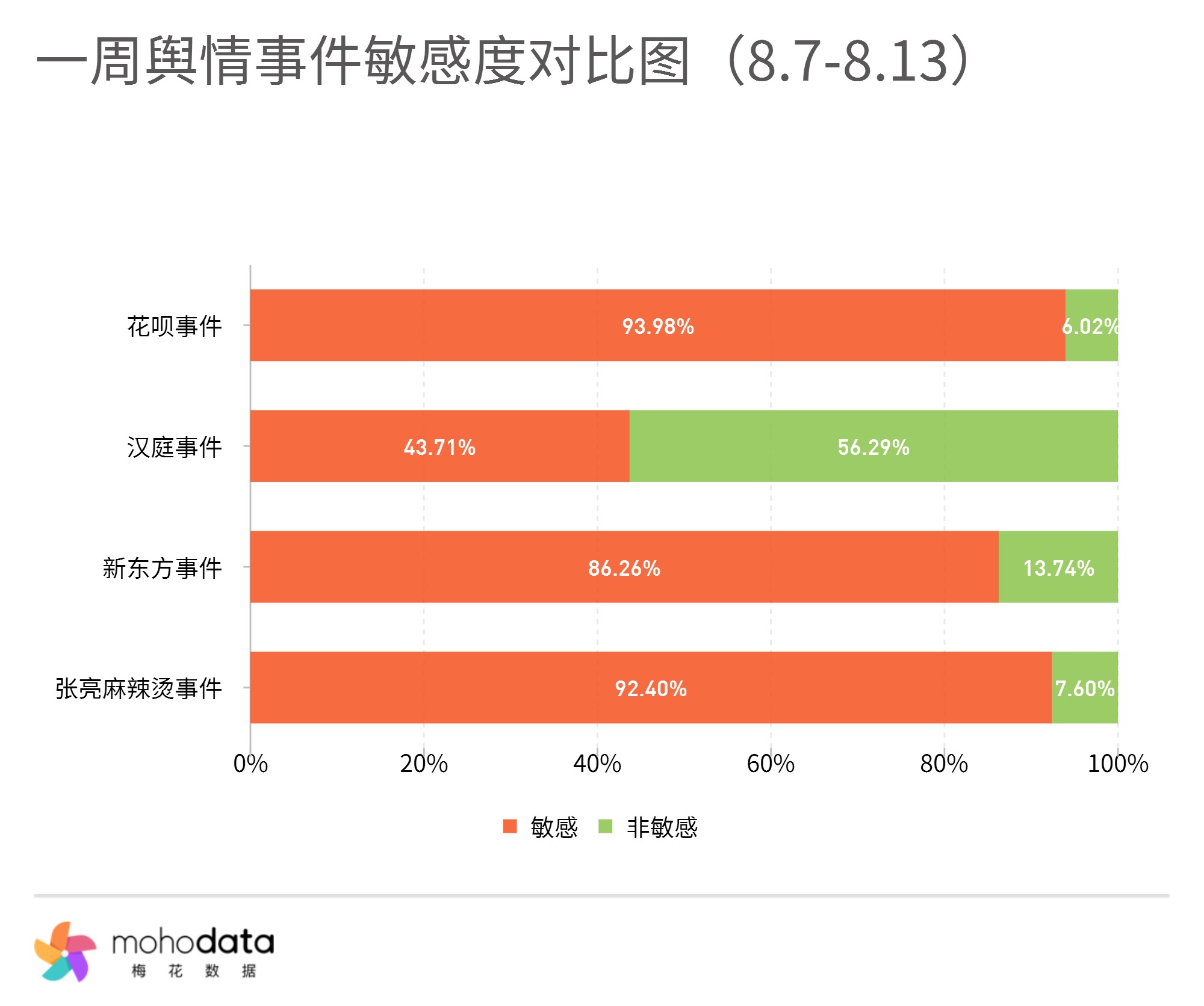 敏感度方面,“花呗事件”相关的敏感度最高,占比达93.98%。“张亮麻辣烫事件”占比达92.40%, “新东方事件”占比达86.26%, “汉庭事件”占比达43.71%。