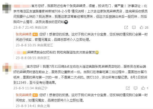 在张亮麻辣烫近期的微博下,更是有网友趁着此事件热度,在其评论区投诉。
