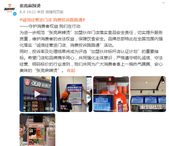8月8日,张亮麻辣烫宣布,全国范围内强化落实“诚信经营进门店、消费投诉路路通”活动。投诉率及处理结果将成为评选“加盟伙伴标杆店认证计划”的重要指标。并通过门店张贴、电子屏显示等方式来显示总部消费者投诉电话。
