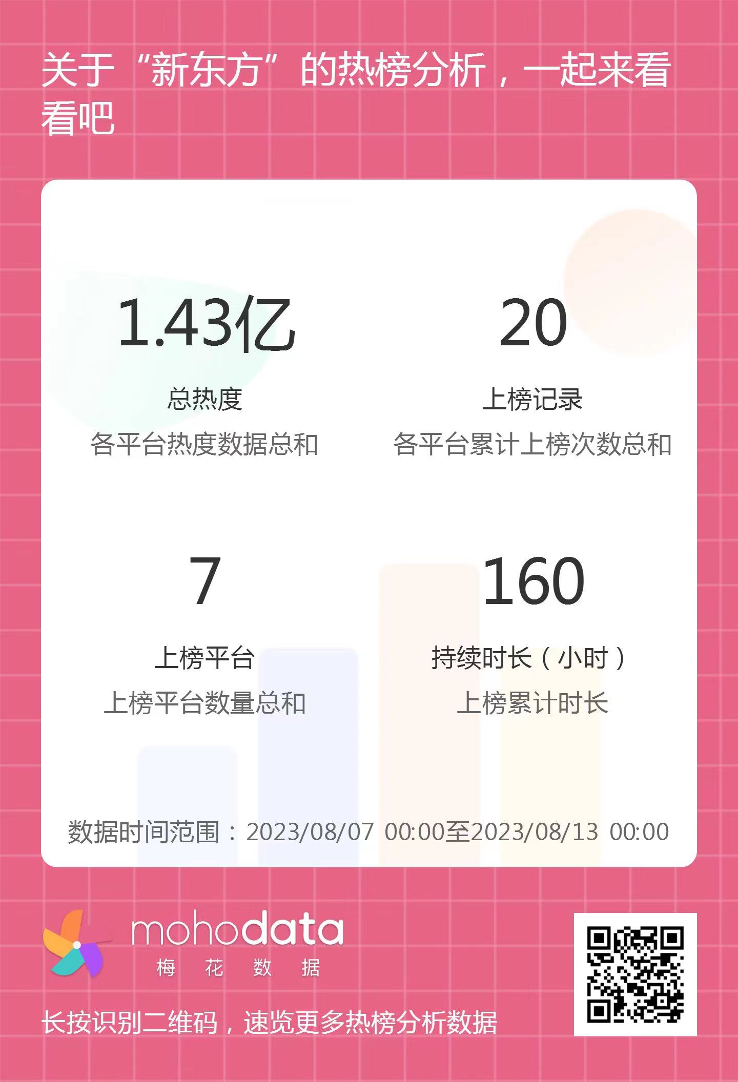热搜方面,梅花数据统计此次新东方事件的相关热搜,其中热搜热度总计1.43亿,上榜记录20次,上榜平台7家,持续时长160小时。详情可扫描以下二维码查看。