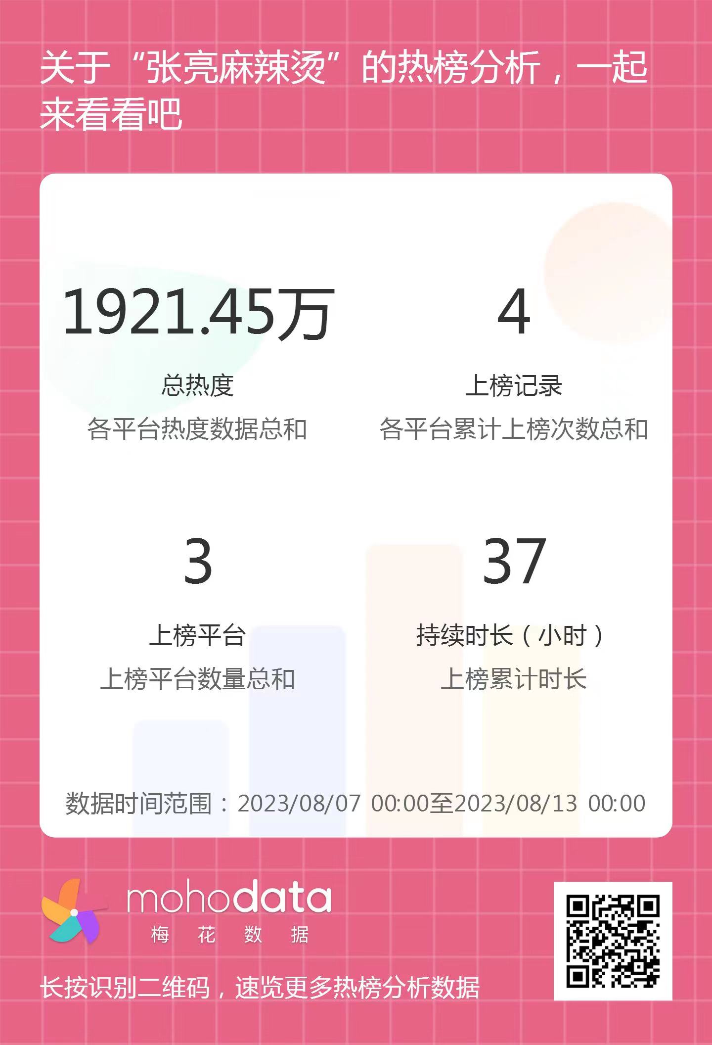 热搜方面,张亮麻辣烫事件相关热搜热度总计1921.45万,上榜记录4次,上榜平台3家,持续时长37小时。详情可扫描以下二维码查看。