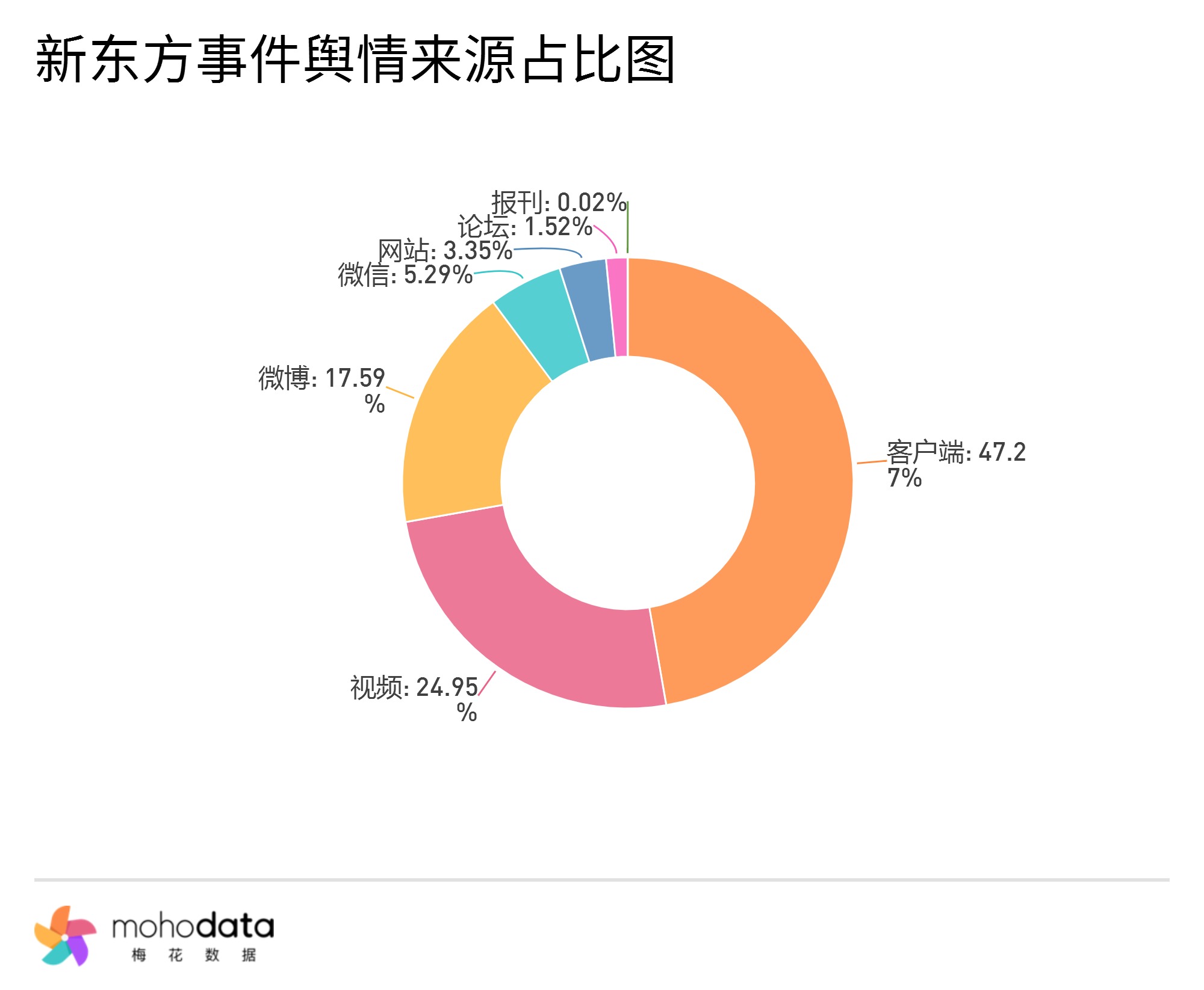 其中信息来源分布图如下图所示,声量主要集中在客户端,客户端占比47.27%,视频占比24.95%,微博占比17.59,其他信息来源占比不超过10%。