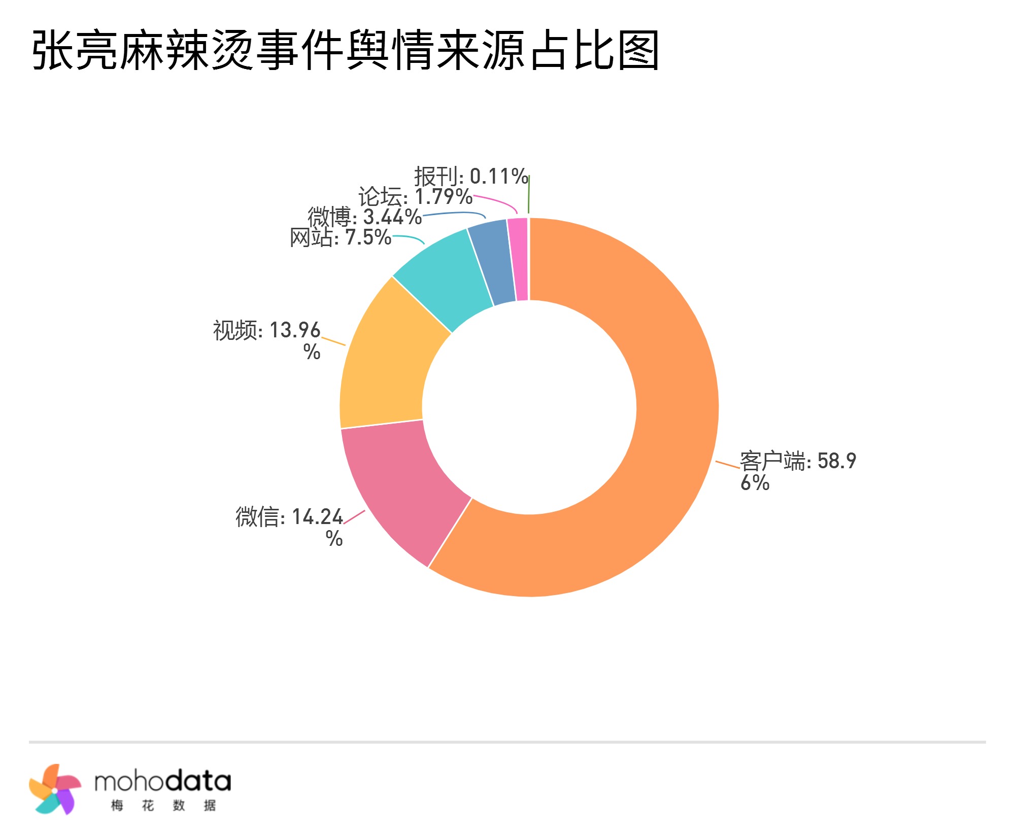 其中信息来源分布图如下图所示,声量主要集中在客户端,客户端占比58.96%,微信占比14.24%,视频占比13.96%,其他信息来源占比不超过10%。