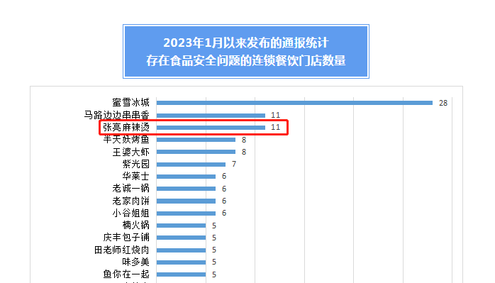 今年7月28日,北京市消费者协会发布的《2023年北京市餐饮企业食品安全大检查》显示,根据北京市、区市场监管局发布的食品安全问题情况通报统计,2023年1月以来,张亮麻辣烫存在食品安全问题的门店多达11家。