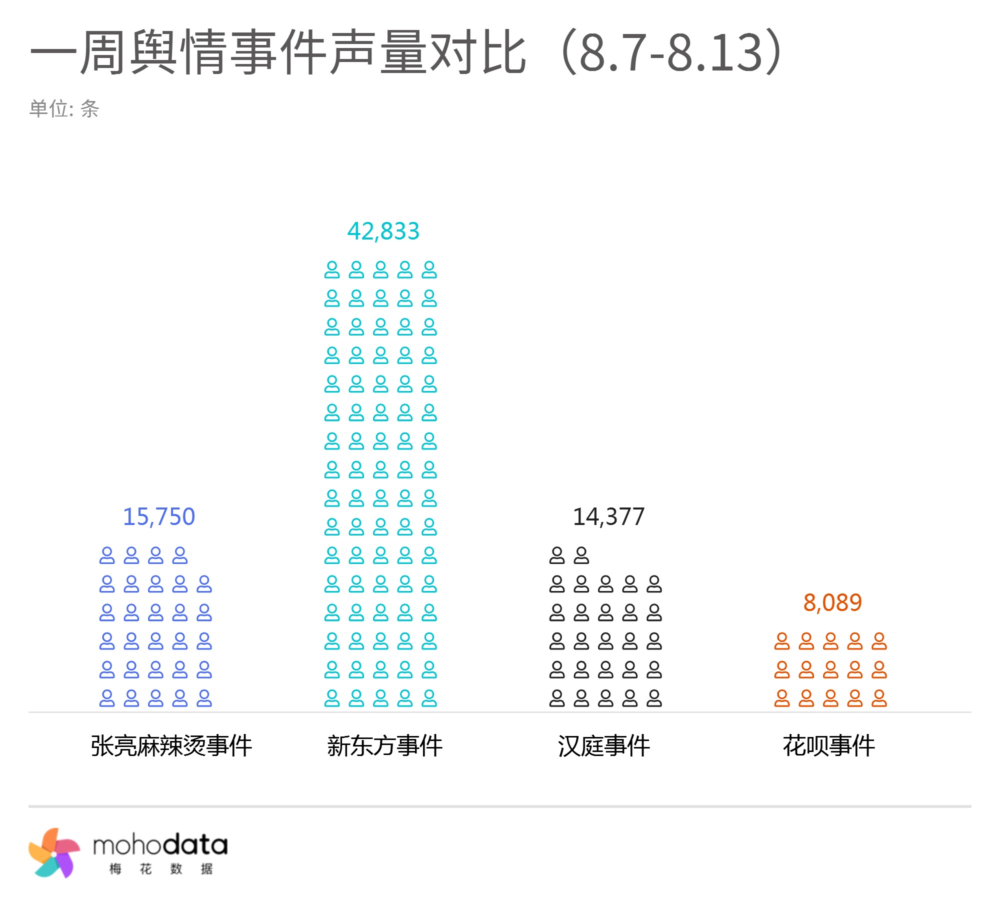 舆情声量方面,上周的主要舆情当中,“新东方事件”声量最高,监测期间共监测到舆情声量42833条,其次 “张亮麻辣烫事件”舆情声量为15750条,“汉庭事件”舆情声量为14377条,“花呗事件”舆情声量为8089条。