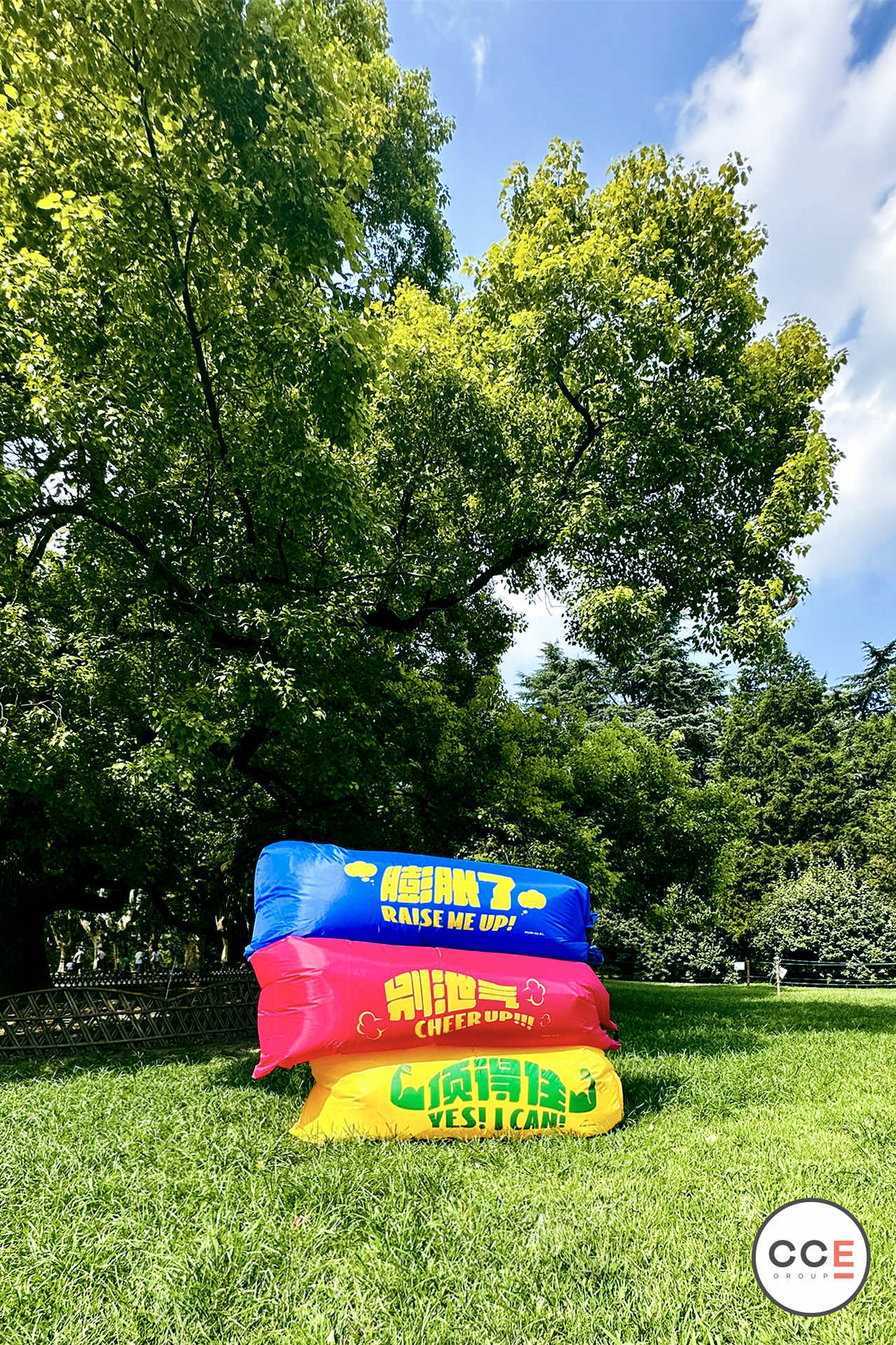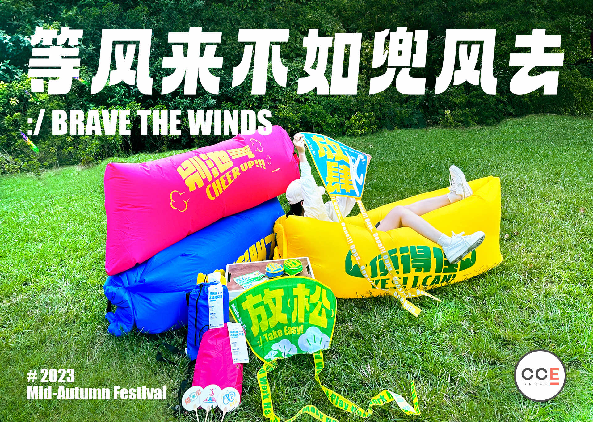 CCE Group送你“兜风一日券“,鼓励你“等风来不如兜风去”,带上印有大字的充气沙发、风筝和扇子,去草地上放飞自我,兜住元气,兜住朝气~