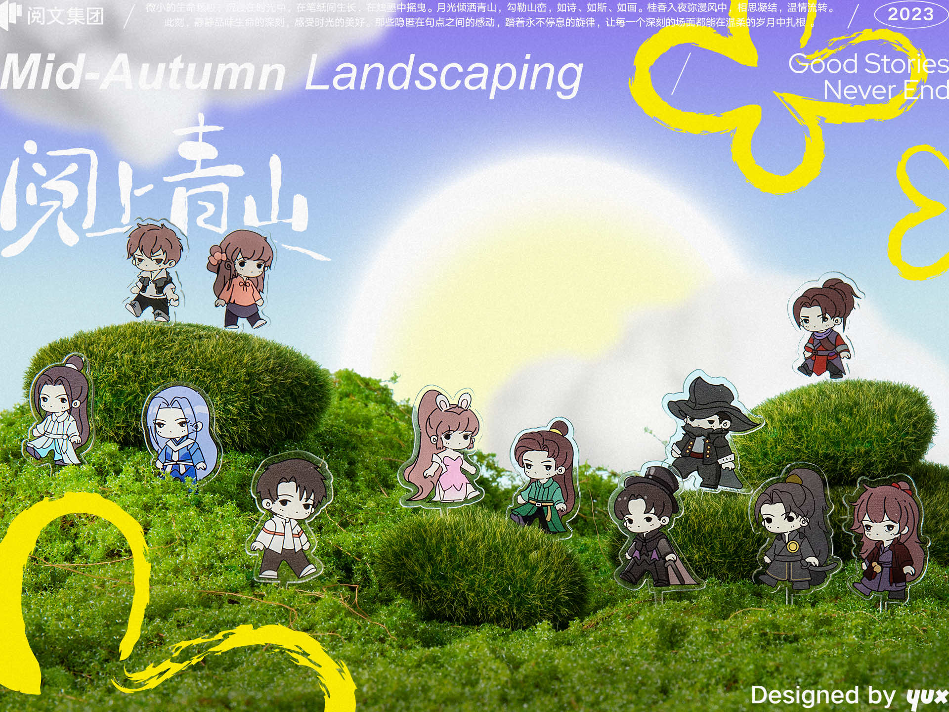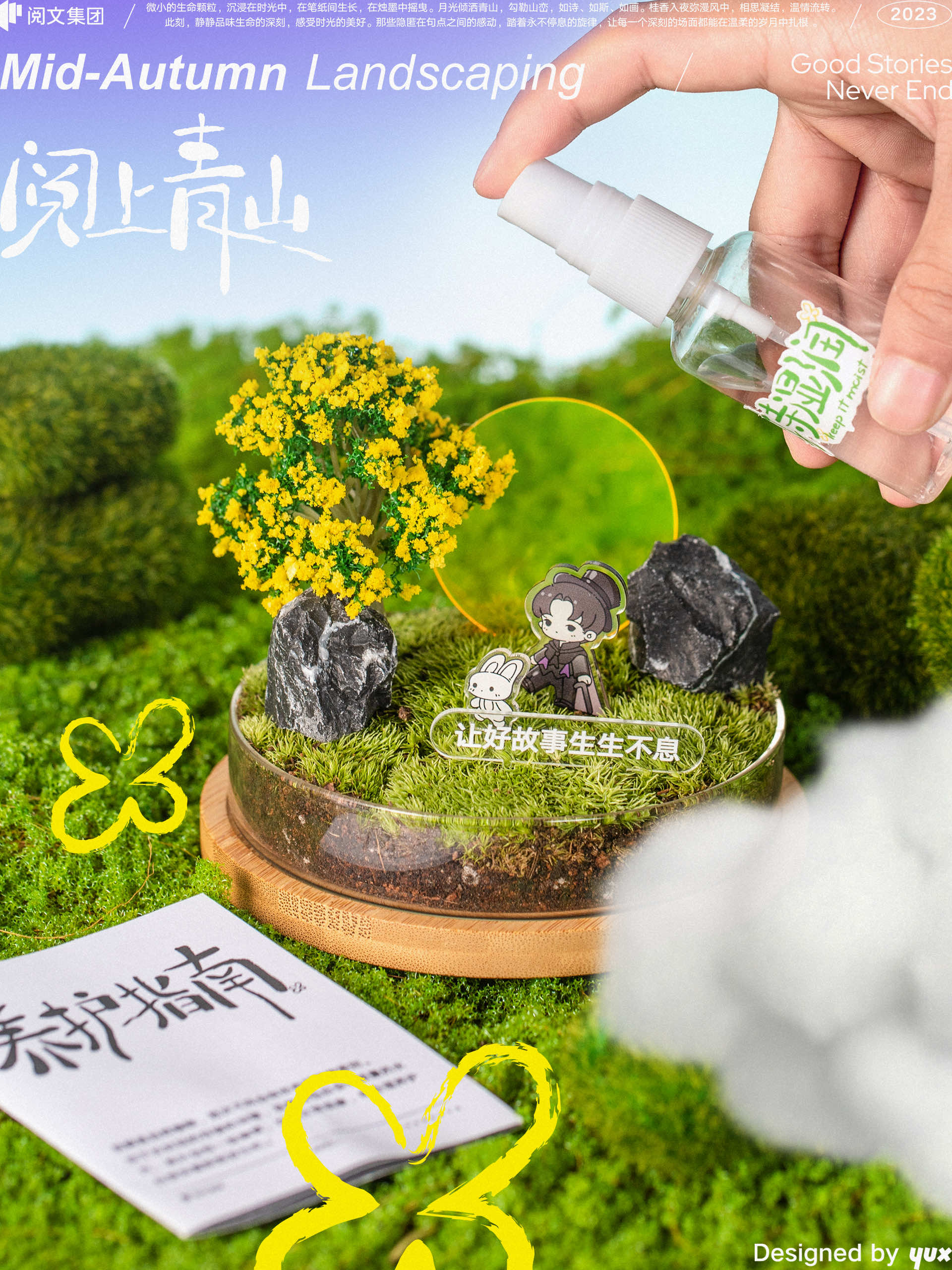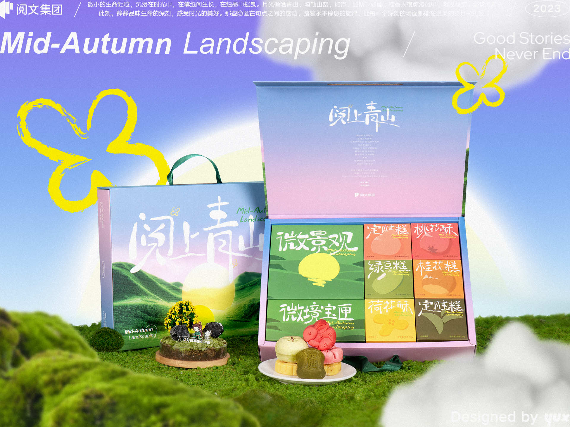 这次的中秋礼盒设计灵感就来源于此。借助3D实景技术,将经典好故事中的人物IP与鲜活植物搭配在一起,取意“阅”上青山的诗意场景。