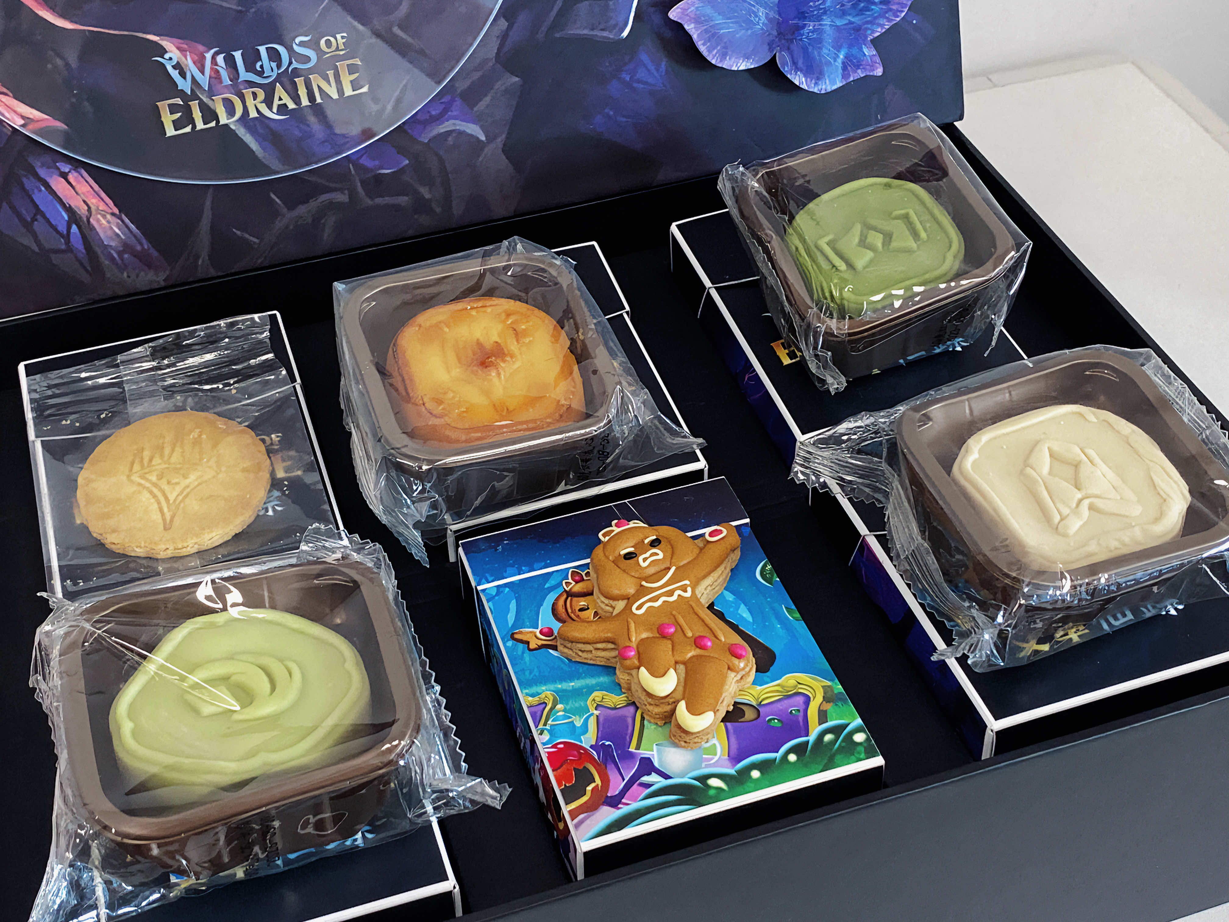 月饼表面的印花造型来自神秘奇幻的鹏洛客标志;饼干则精美还原了卡面上精巧可爱的姜饼人与万智牌logo。