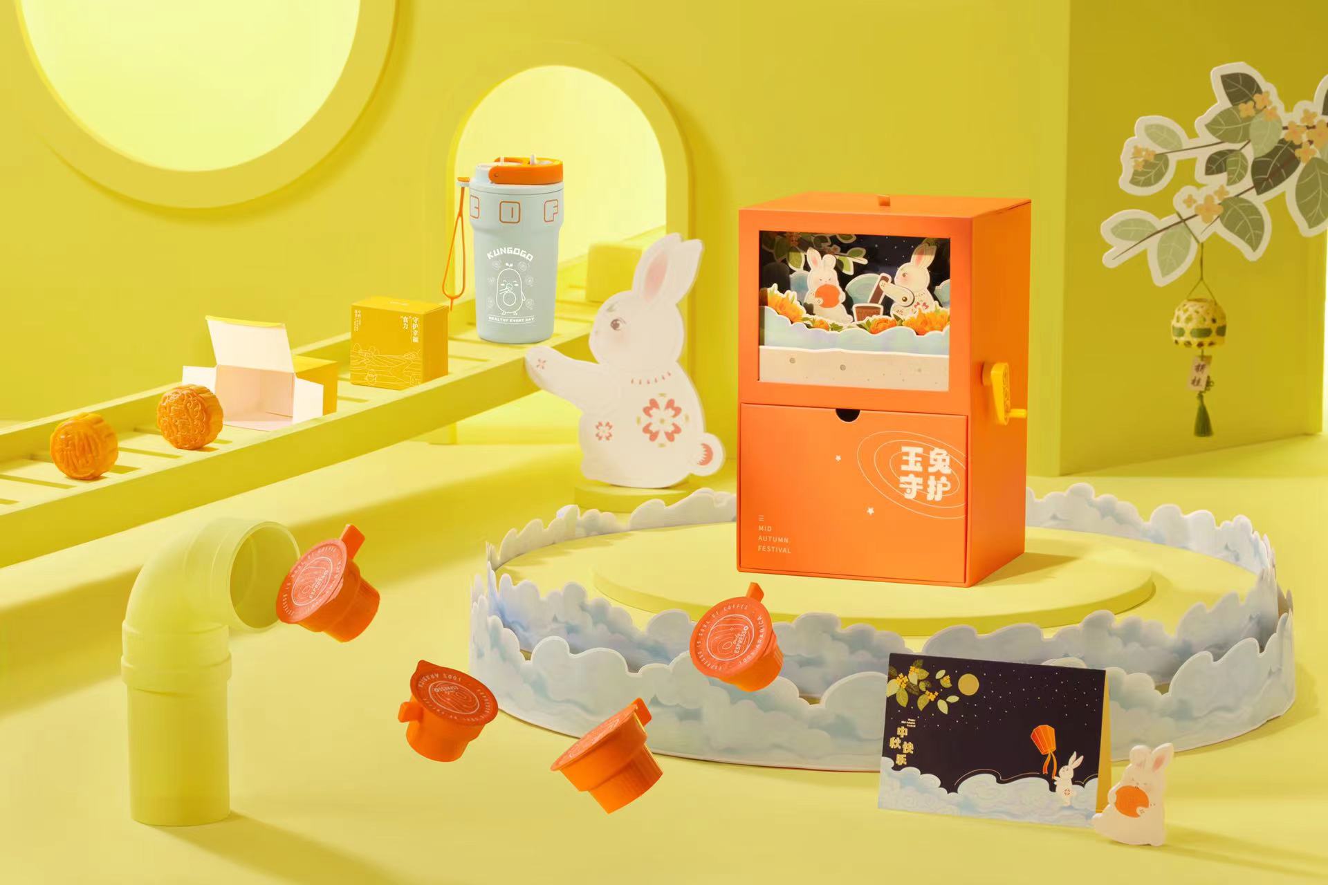 可立兔耳月饼盒童趣生动;露营灯是宫灯造型,代表着中秋遐思,愿团圆、愿事成,致意探索者,点亮前行的光灿。