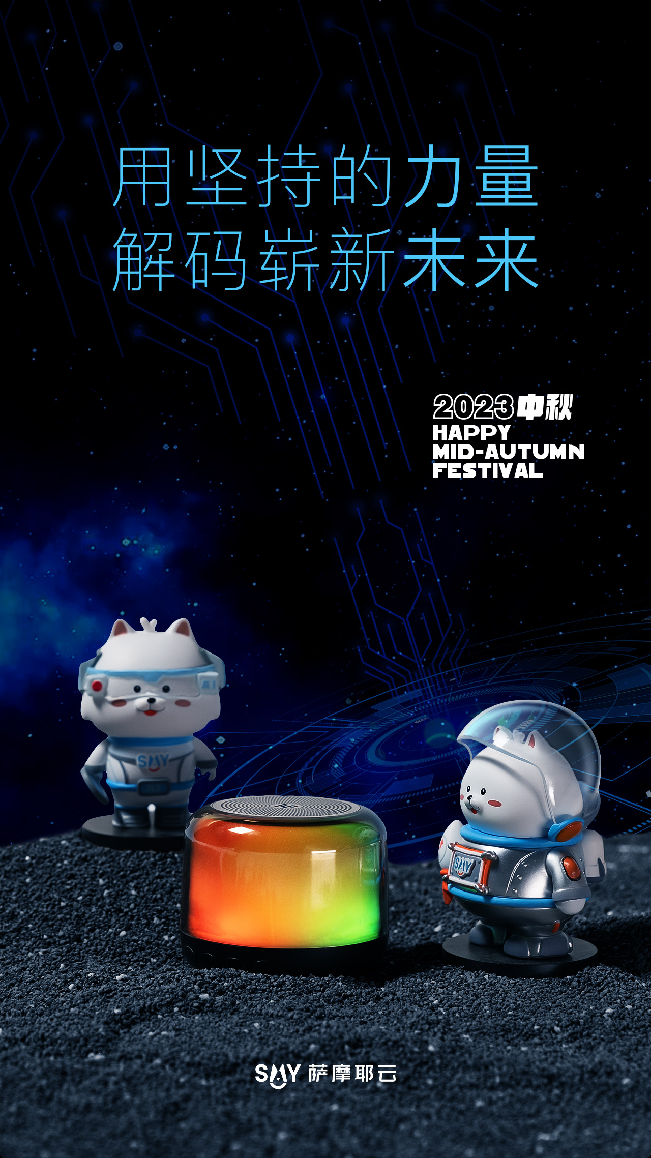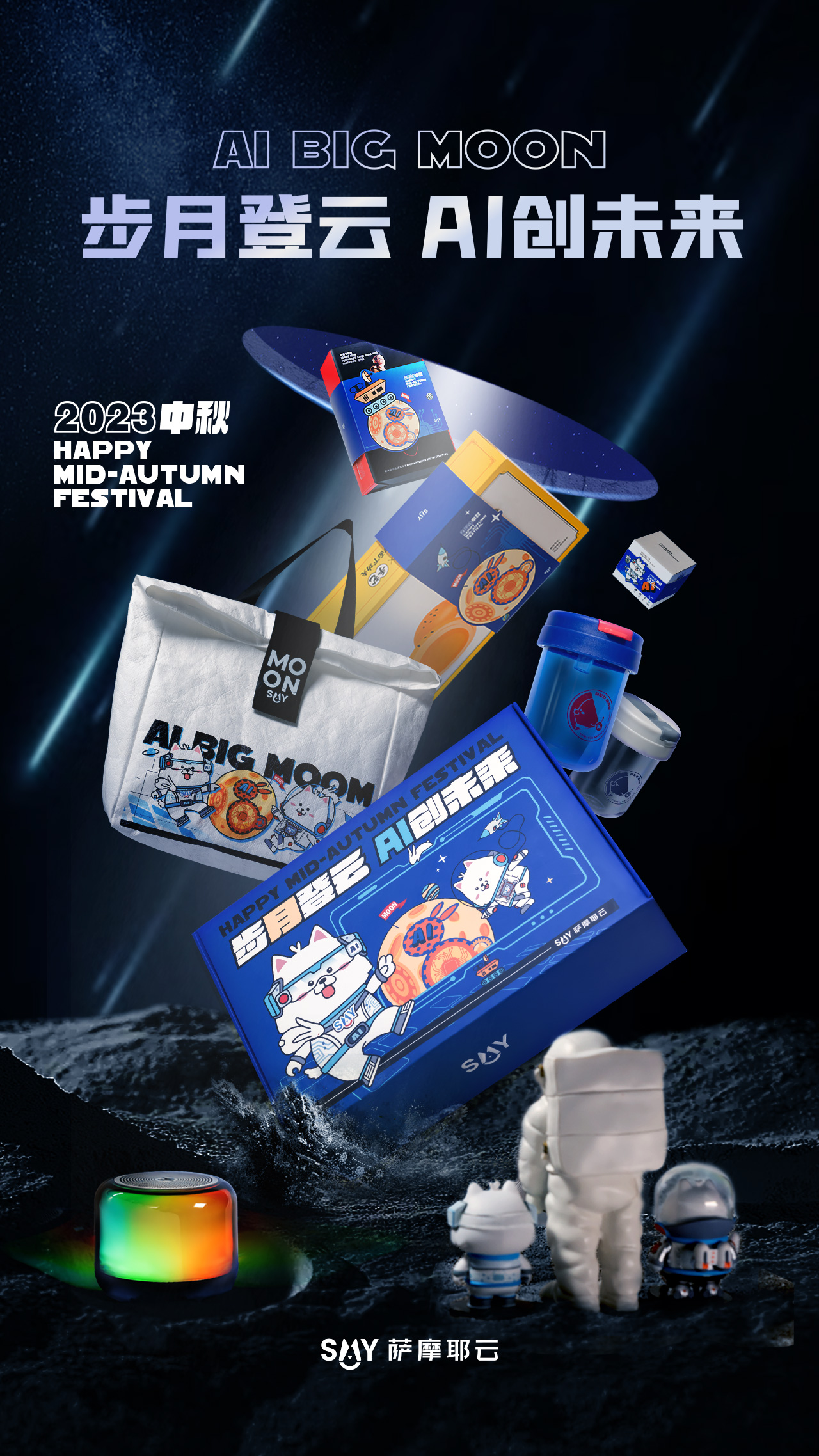 萨摩耶云的中秋AI科技礼盒以“步月登云,AI创未来”为主题,吉祥物“好耶”变身戴着智能眼镜的“AI耶”,和身着航天服的“太空耶”。