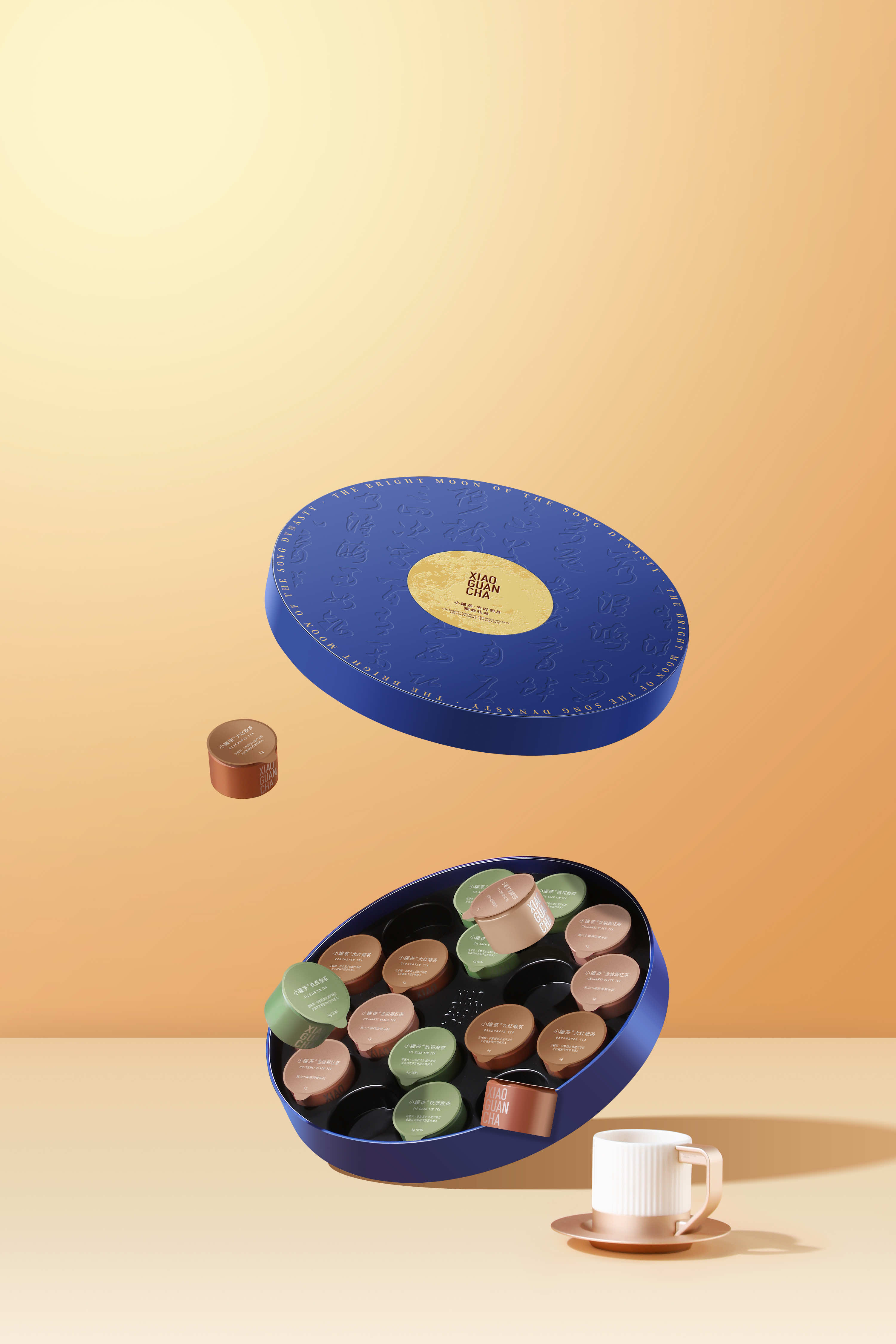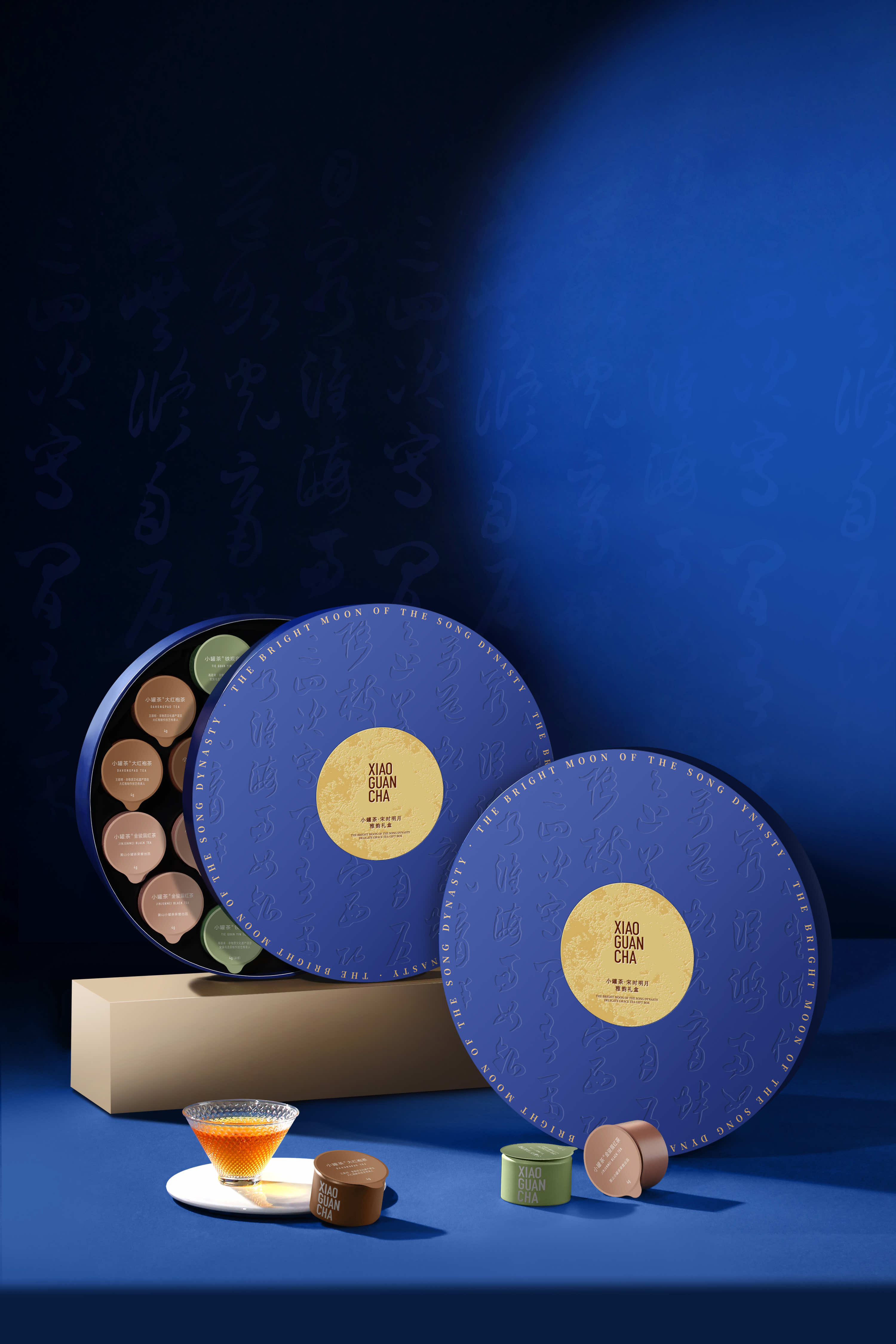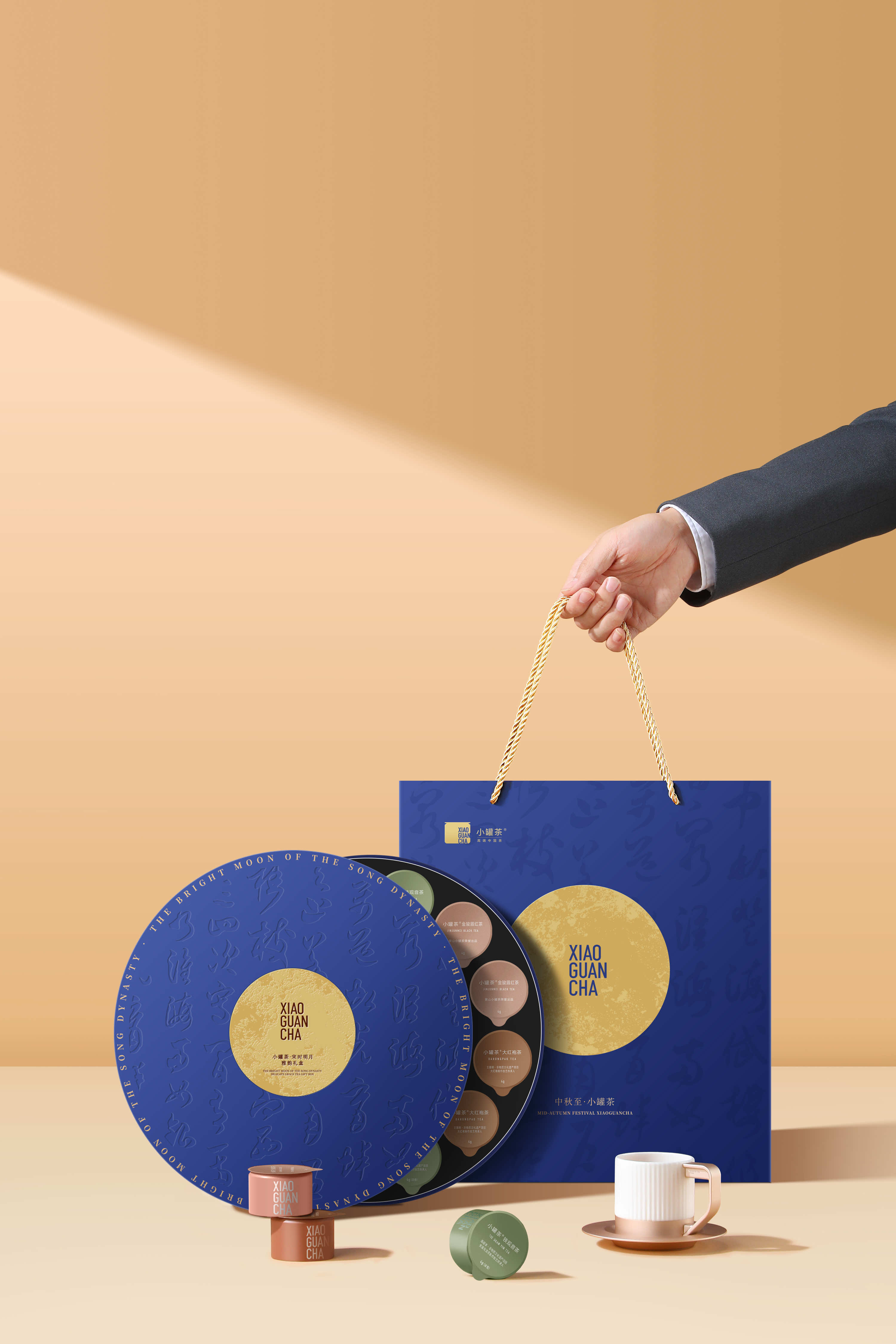 小罐茶的礼盒以中秋蓝为底色,中间是一轮烫金圆月。