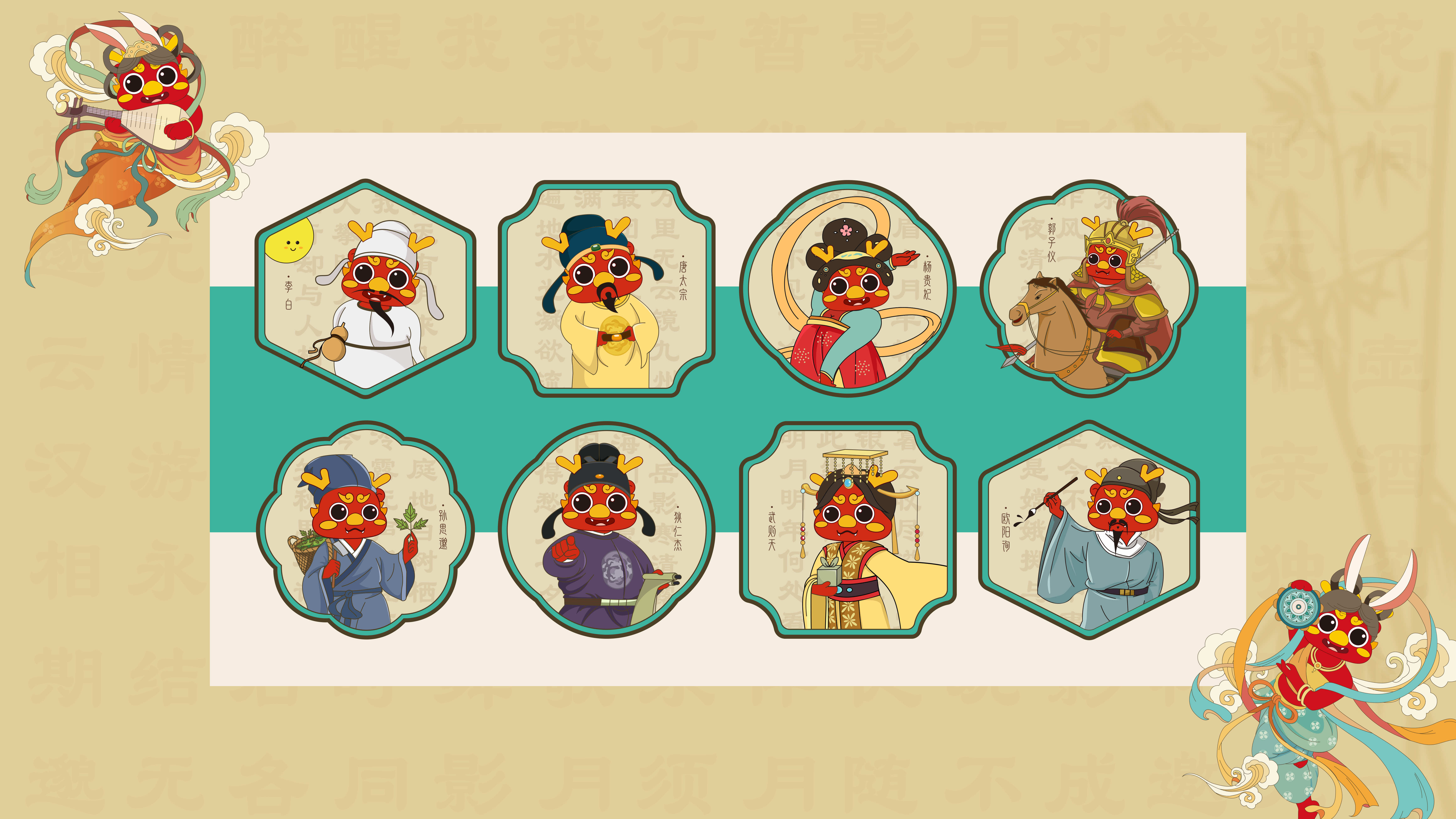 唐朝是“中秋节”初现雏形的时期,也是历史上最繁华昌盛的朝代。圣历将品牌IP形象“圈圈”与唐朝的八位历史人物相结合,分别印在8枚月饼的包装盒。“人物”背后是谜面,为礼盒增加了趣味性。